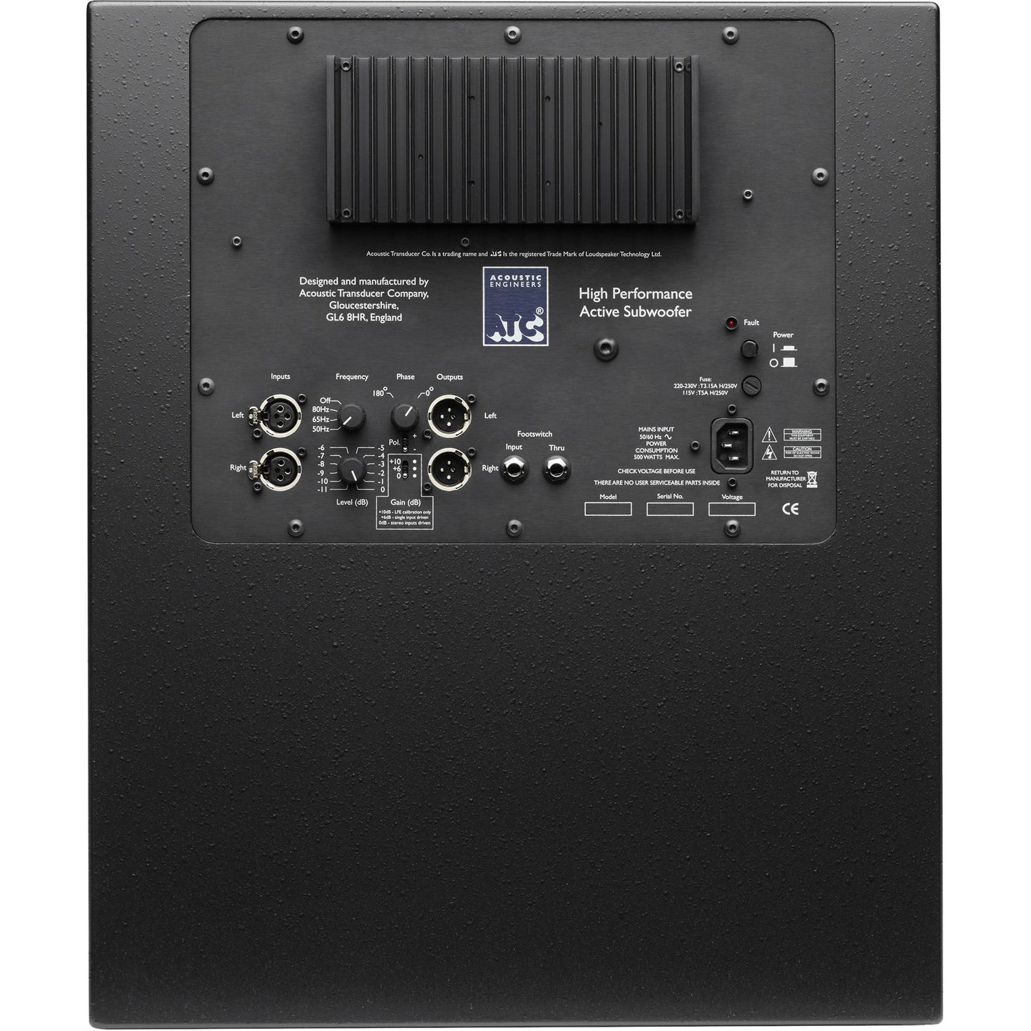 The SCS70s convection cooled amplifier is mounted in the rear of the SCS70 Pro cabinet. Two balancedinputs enable connection to mono orstereo sources. A pair of buffered, un-filtered balanced outputsare provided for connection to partnering active monitor loudspeakers or to‘daisy-chain’ multiple subs.21dB range of gain control, three low pass frequency settings, polarity switch and a 180 degreecontinuously variable phasesetting allow the user to optimize the subwoofer for use with a very widerange of partnering loudspeakers. The low pass filter can also be set to ‘Off’ (320Hz) should the userwish to use the SCS70 Pro with external processing. The amplifier features fault monitoring of amppanel temperatureand power amplifier D.C offset either fault condition is indicated via illumination of asinglered LED mounted on the amp panel.