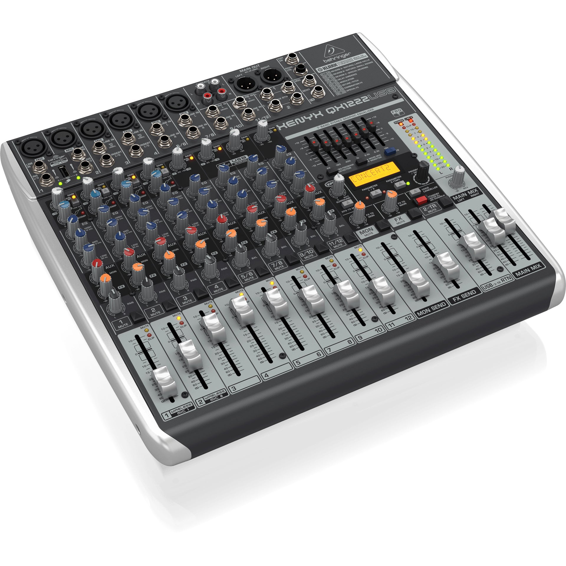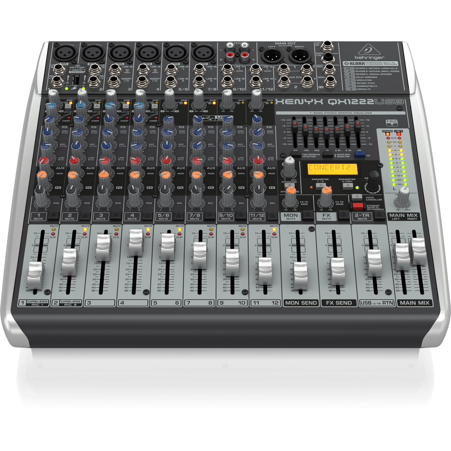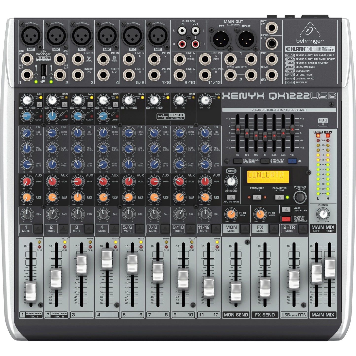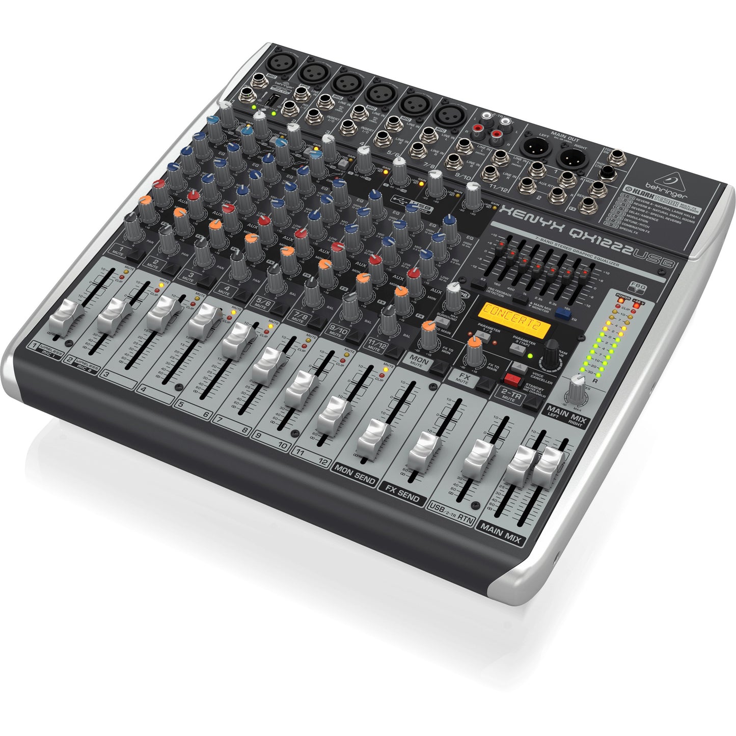Each of the 6 XLR inputs offers warm, smooth analog sound reproduction thanks to XENYN mic-preamps and an easy-to-use one-knob compressor. All 12 channels feature a 3-band “classic U.K-voiced” E.Q, 100 preset stereo digital effects, traditional slide faders, and a 7-band universal graphic E.Q.