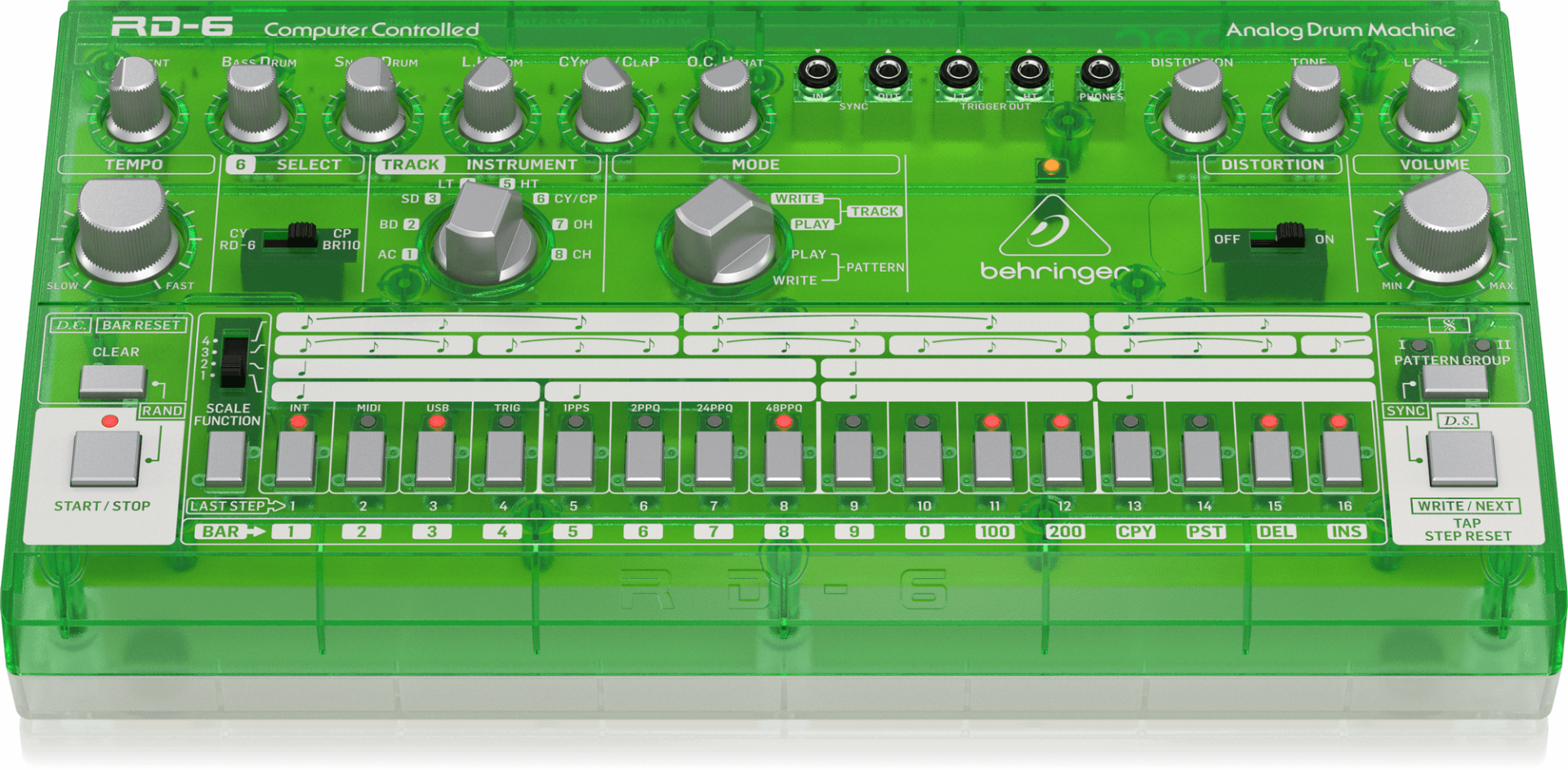 - 16 authentic-style step buttons with LED indicators for easy pattern creation