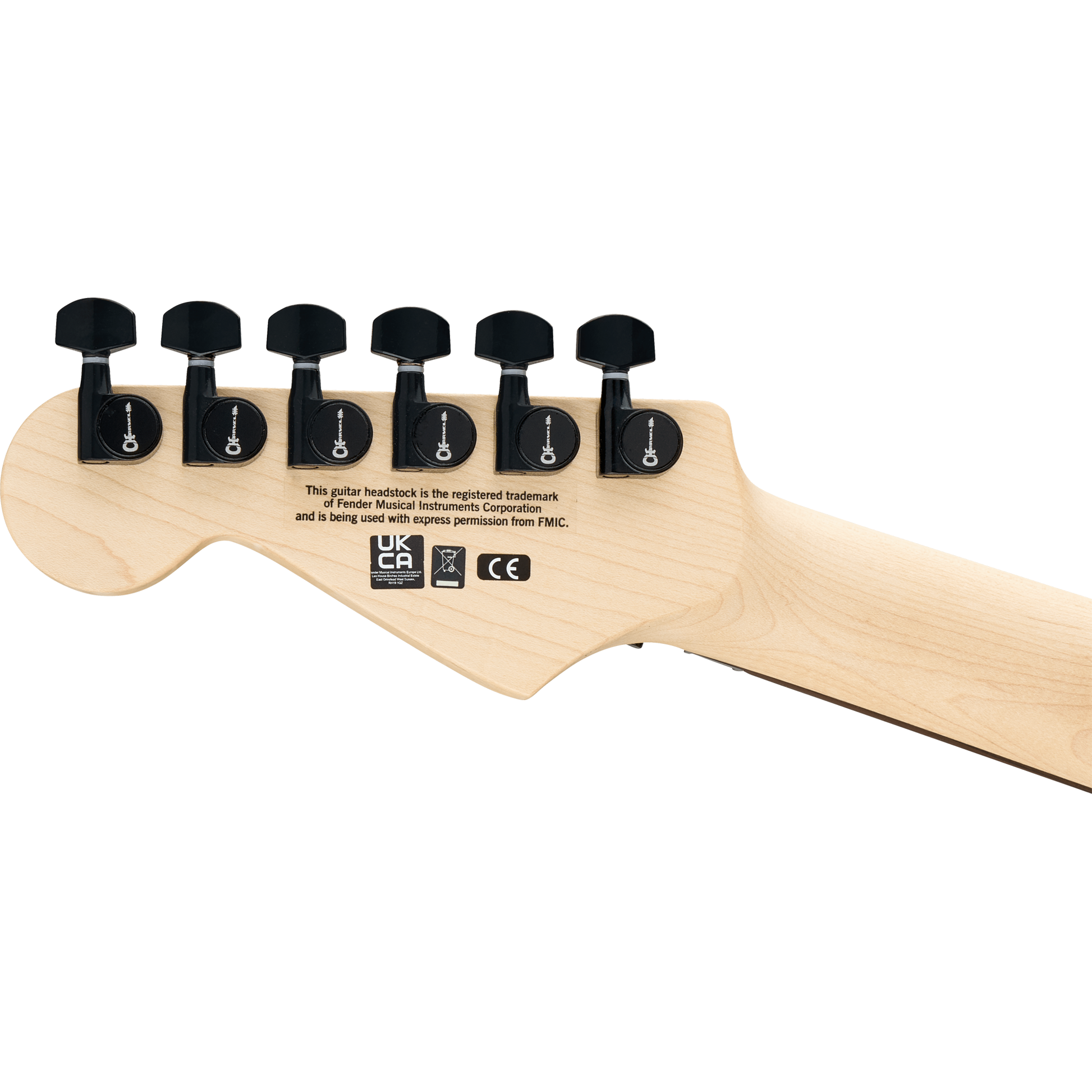 - Charvel®-branded sealed die-cast tuners, Charvel neck plate and standard strap buttons