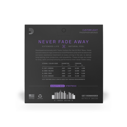 Since D'Addario introduced Phosphor Bronze acoustic guitar strings in 1974, they've been synonymous with warm, well-balanced tone—and since we developed this set exclusively with Taylor Guitars, there has been no better option for the GS Mini Bass. XT Taylor Mini Bass acoustic strings are constructed with a multi-filament core, phosphor bronze wrap wire, and an advanced corrosion resistance coating, affording tonal versatility with added resilience, excellent for a wide range of acoustic bass styles. This 37-90 Custom Light gauge set is made specifically for the Taylor GS Mini Bass and will also fit with other similarly-sized instruments.