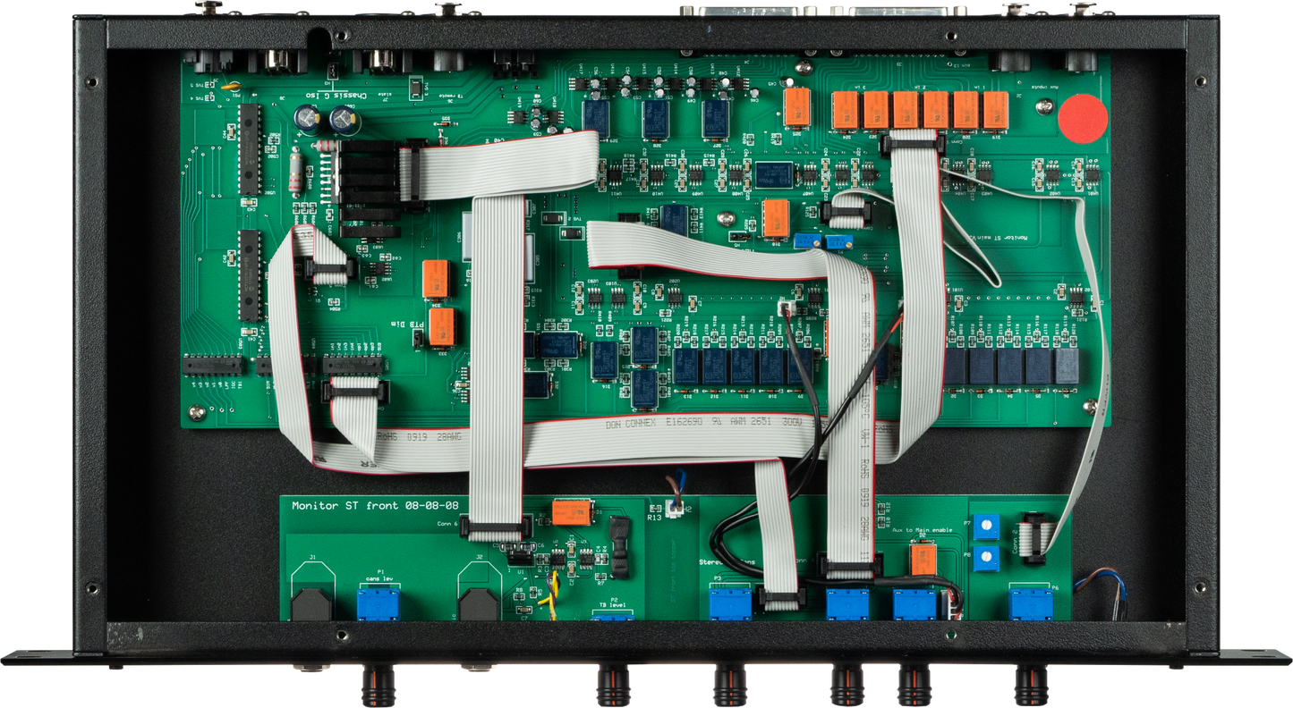 True craftsmanship is in the details. If you can’t hear the nuances of what you’re working on, then you simply can’t make informed decisions. Everything from placing a mic, to turning a knob on an EQ, to coaching a singer though a delicate passage depends on being able to hear exactly what’s going on. With the advent of “prosumer” gear, the monitoring path is typically sacrificed to meet a price-point, and even some of the world’s most revered and expensive large-format consoles have less-than-accurate center sections that obscure the sound. To solve these problems, we’ve made zero compromises  in the MONITOR ST, employing audiophile-grade components in an unconditionally transparent design. Whether you’re working in a project studio or managing the complex monitor routing in a multi-room studio, the MONITOR ST will provide the most accurate and reliable monitoring available anywhere.