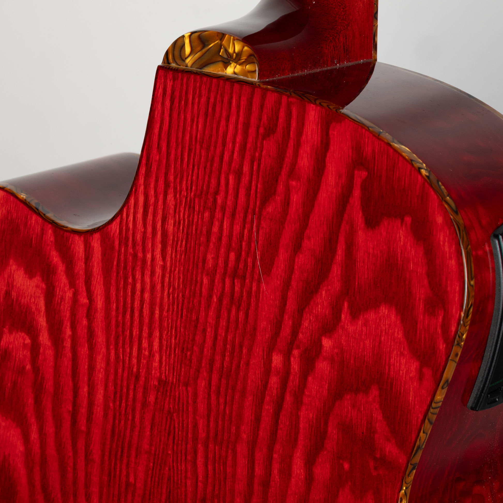 There is a small chip on the upper left side of the headstock, along with minor scuffs and light pick scratches below the soundhole.