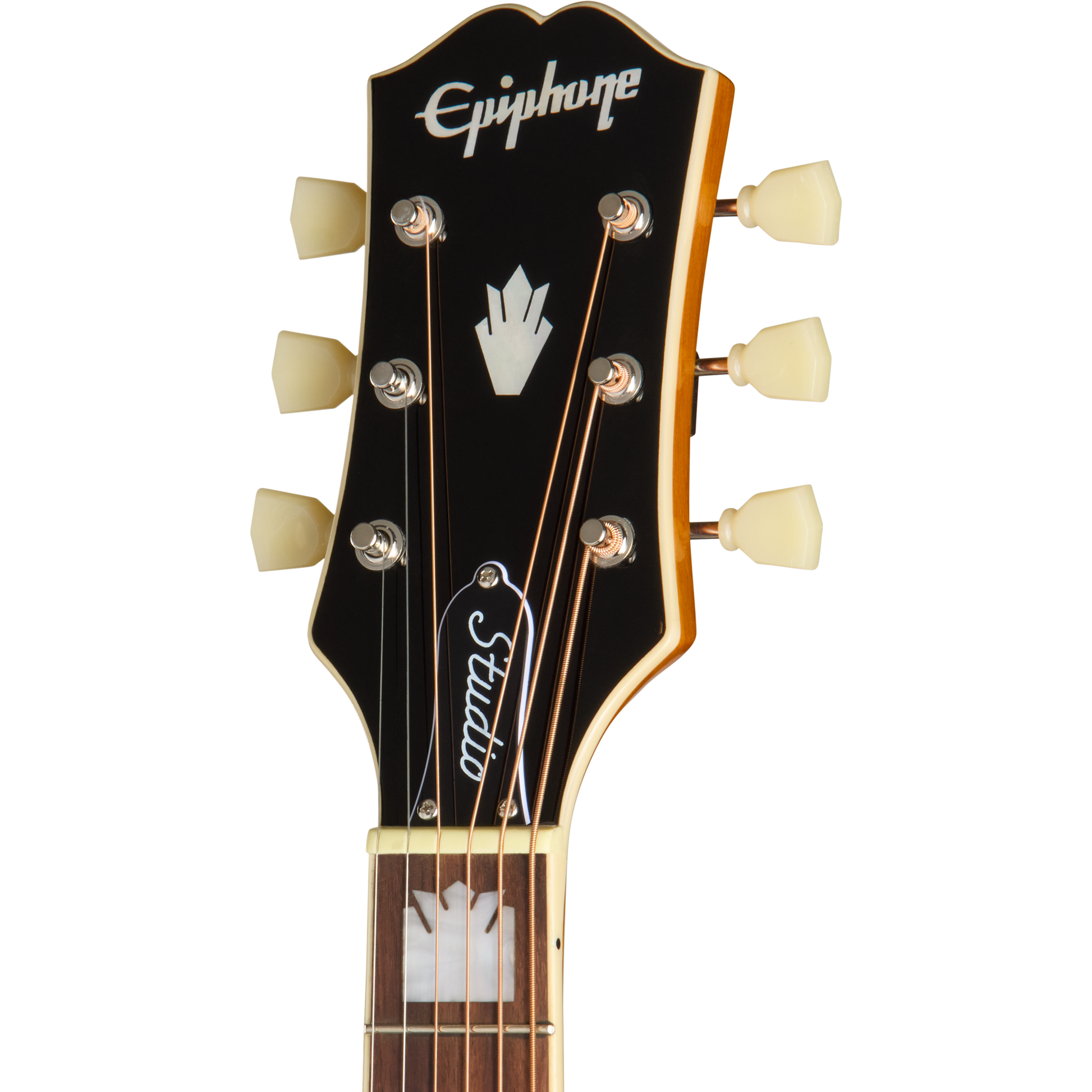 Other features that give the J-200 Studio EC even more vintage-style visual pizazz include an iconic J-200 style tortoise shell-colored pickguard with classic two-color J-200 graphics, Epiphone Deluxe tuners with Keystone buttons, and a bound 60s Kalamazoo-style headstock with the Epiphone logo and Gibson Crown proudly displayed in mother of pearl. The J-200 Studio EC comes with Fishman® electronics, including an S-Core under-saddle pickup and Fishman Presys™ II preamp with side-mounted volume, bass, treble, and phase controls. It also has a convenient built-in electronic tuner that makes tuning up quick and easy.