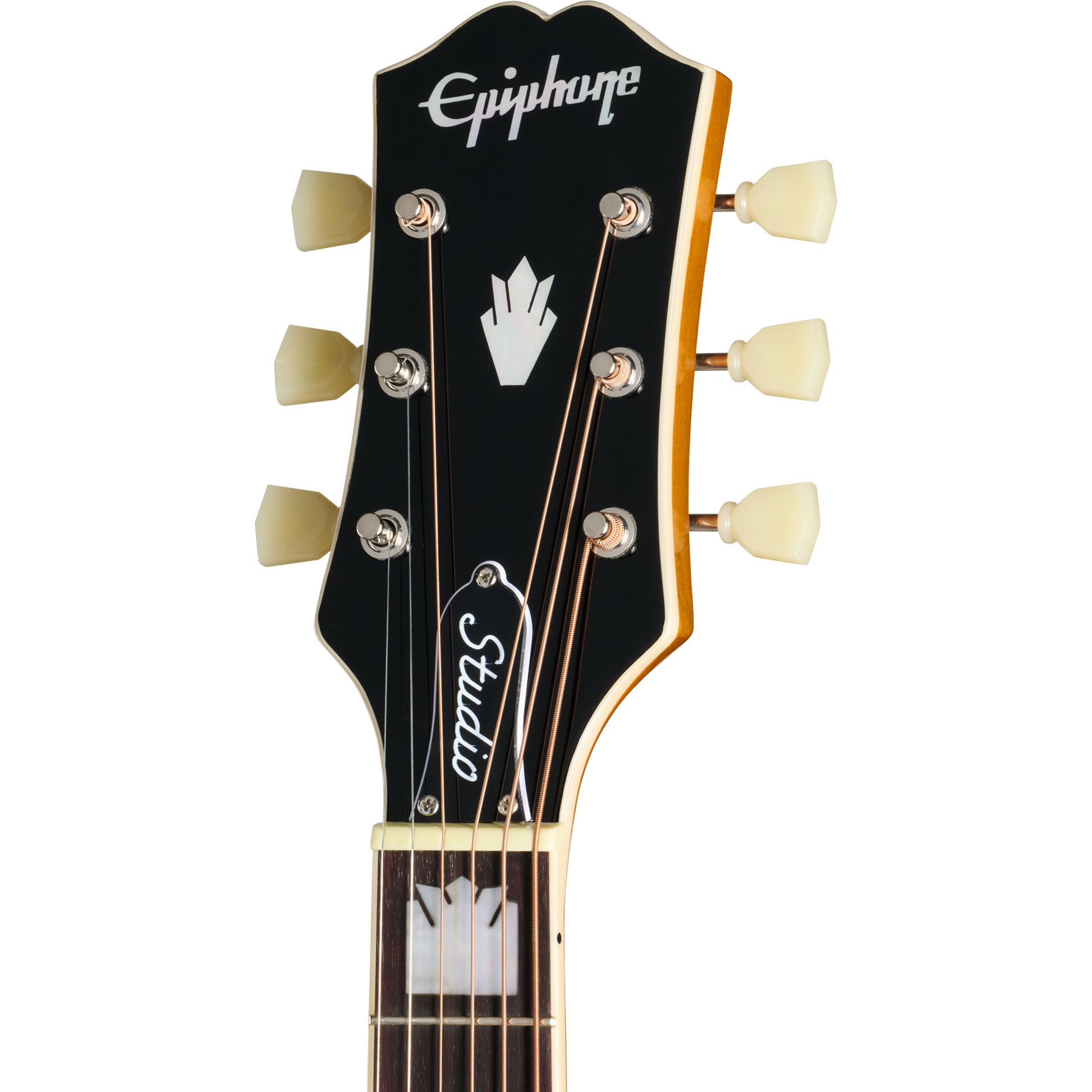 Additional vintage-style visual elements include a classic J-200-style tortoise shell-colored pickguard with the legendary two-color J-200 graphics, Epiphone Deluxe tuners with Keystone buttons, and a bound 60s Kalamazoo-style headstock with the Epiphone logo and Gibson Crown displayed in mother of pearl. The J-200 Studio is equipped with Fishman® electronics, including an S-Core under-saddle pickup and a Presys™ VT preamp with soundhole-mounted volume and tone controls that are easy for the player to access while remaining nearly invisible to the audience.