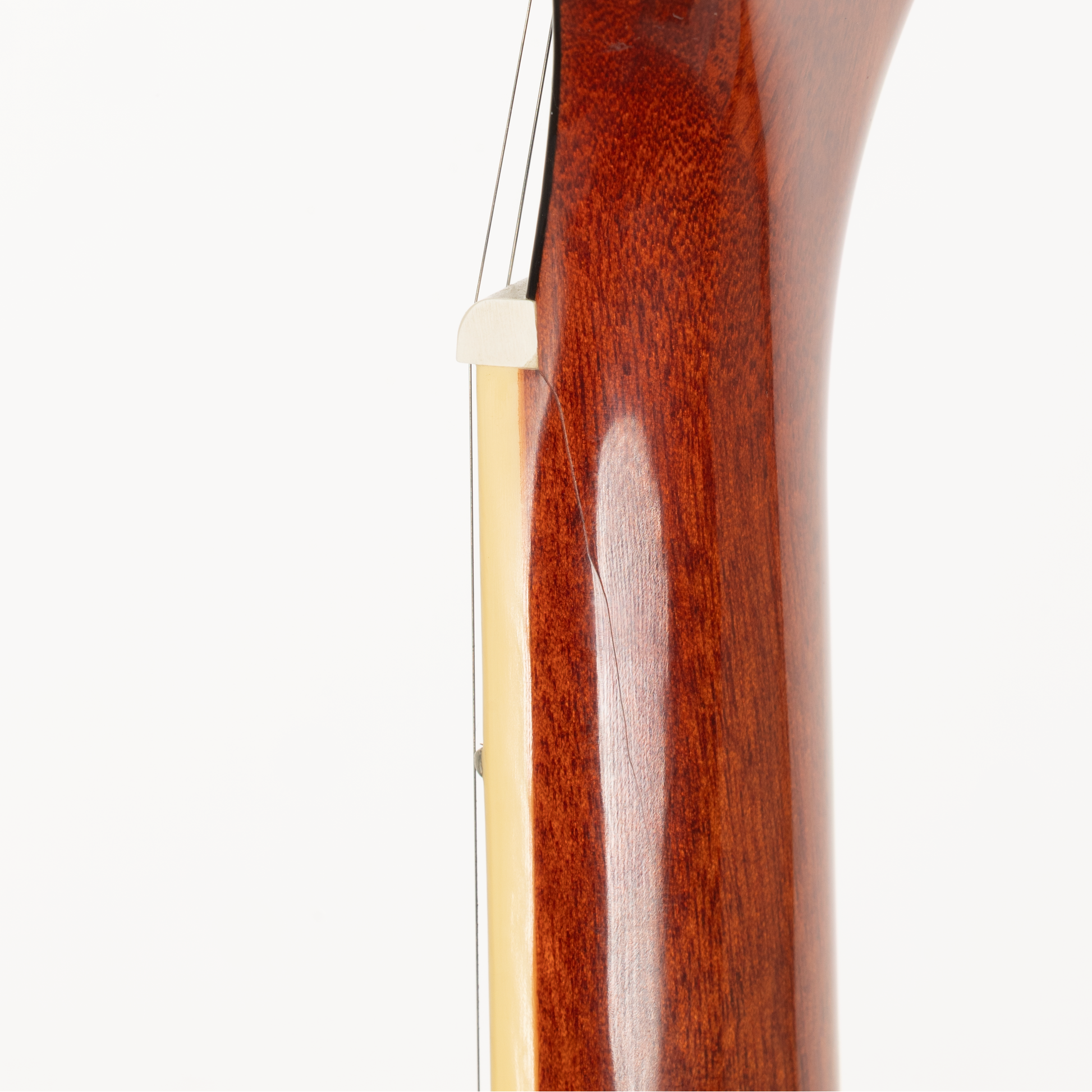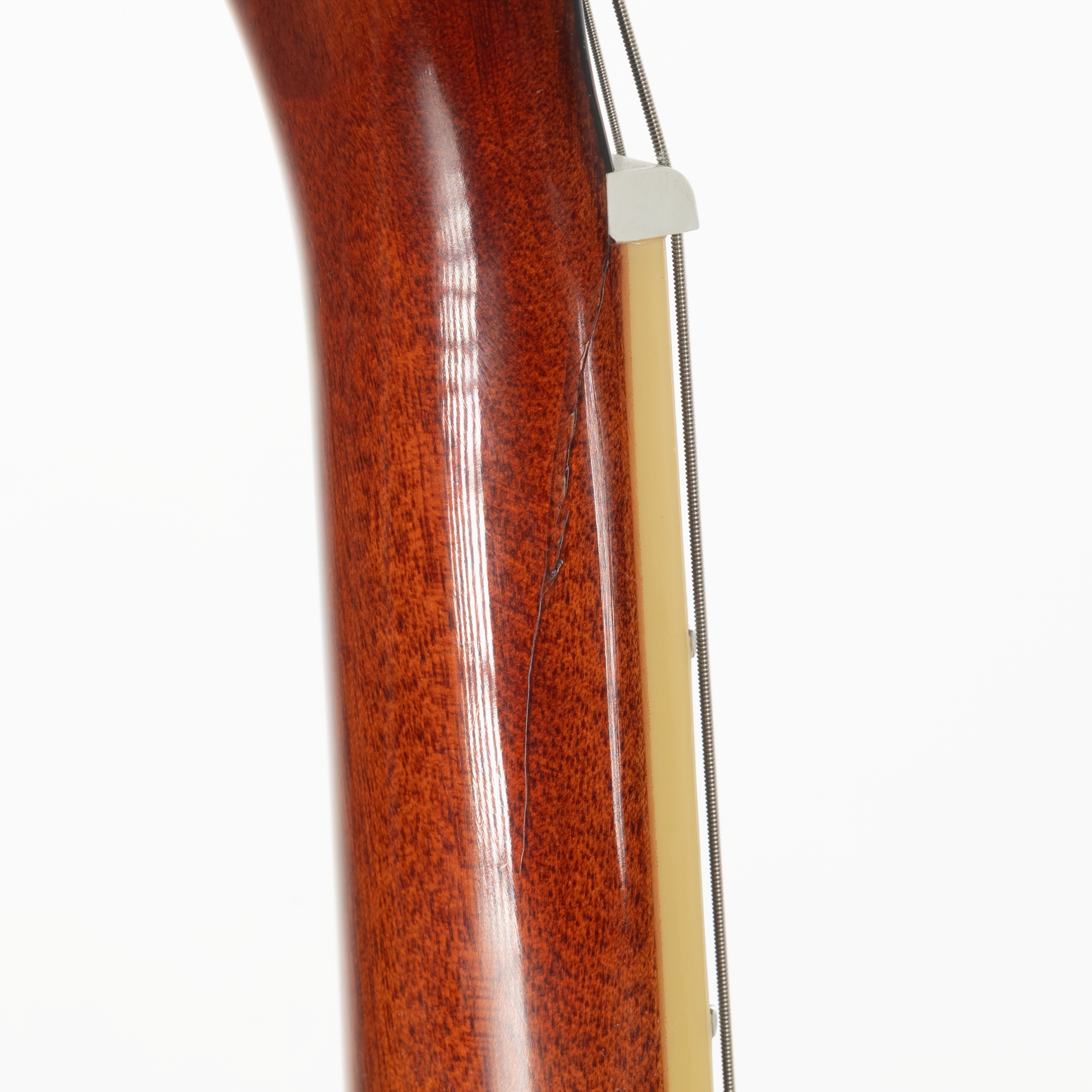 The neck has repaired cracks behind the nut on both sides, and there are impact marks on the body. See photos for details.