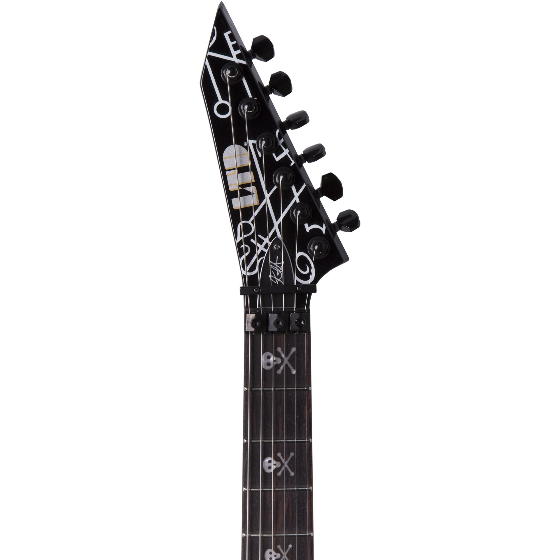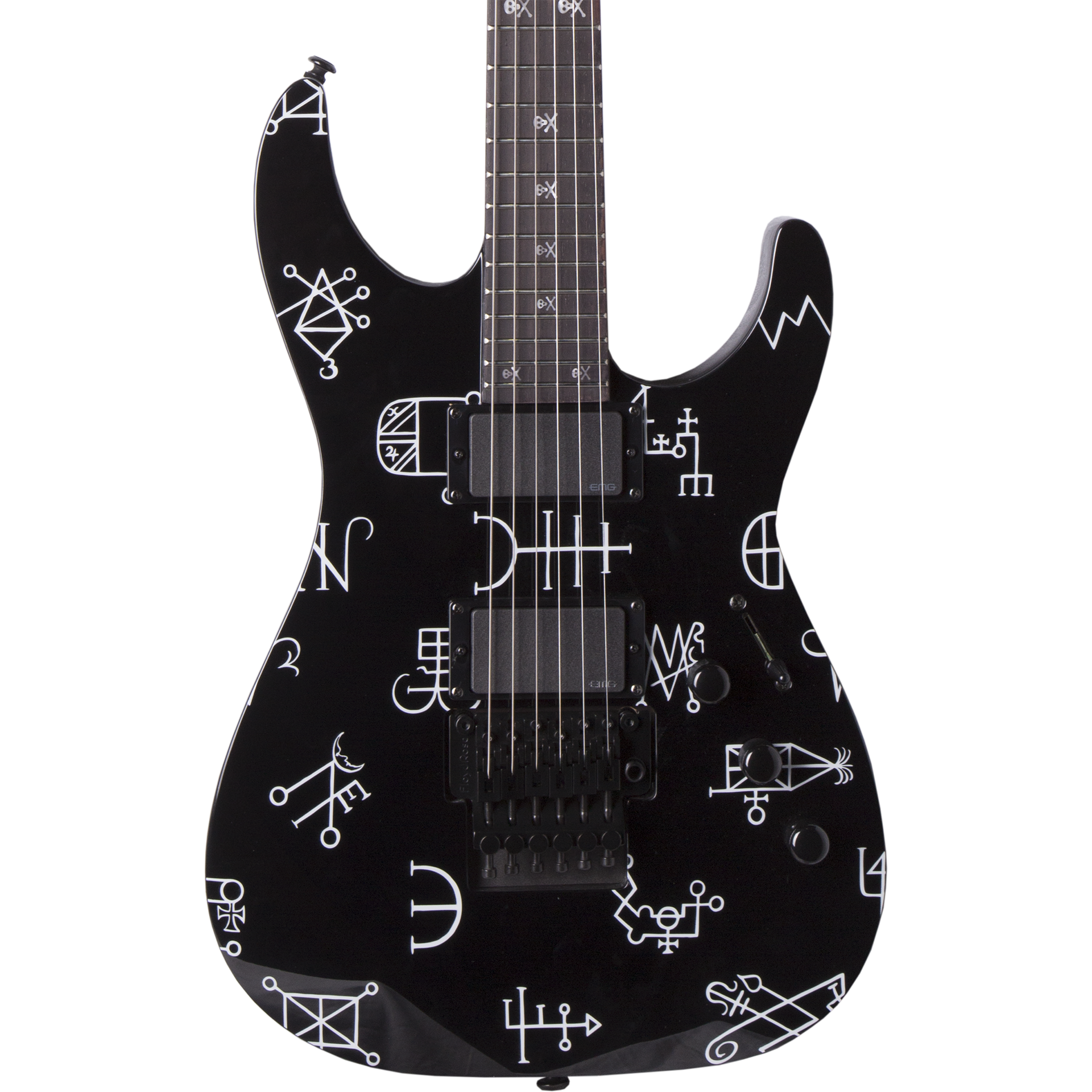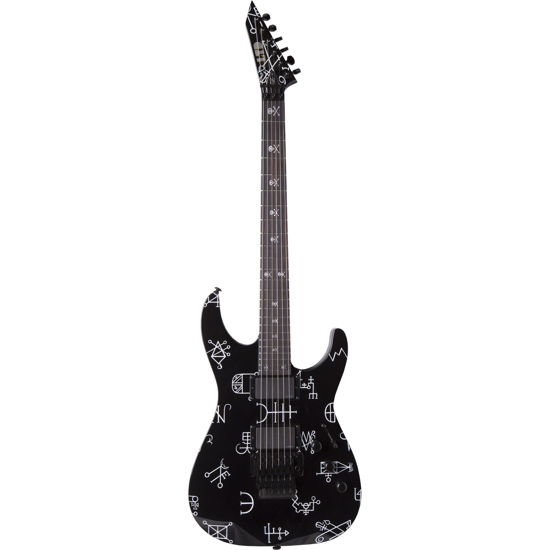 Metallica's Kirk Hammett is fascinated by the strange and macabre aspects of life, evidenced by his custom guitars featuring classic horror art and paranormal phenomena, most famously seen in his well-known Ouija guitars. The next step in his LTD Signature Series is the KH Demonology, a guitar powerful enough to summon the mightiest of dark forces. Over its black finish are a number of sigils, which are ancient symbols reputed to be imbued with magical power that allows the owner to summon demonic entities. Whether or not you use the KH Demonology as a portal to magical dimensions, it's an amazing musical instrument in its own right.