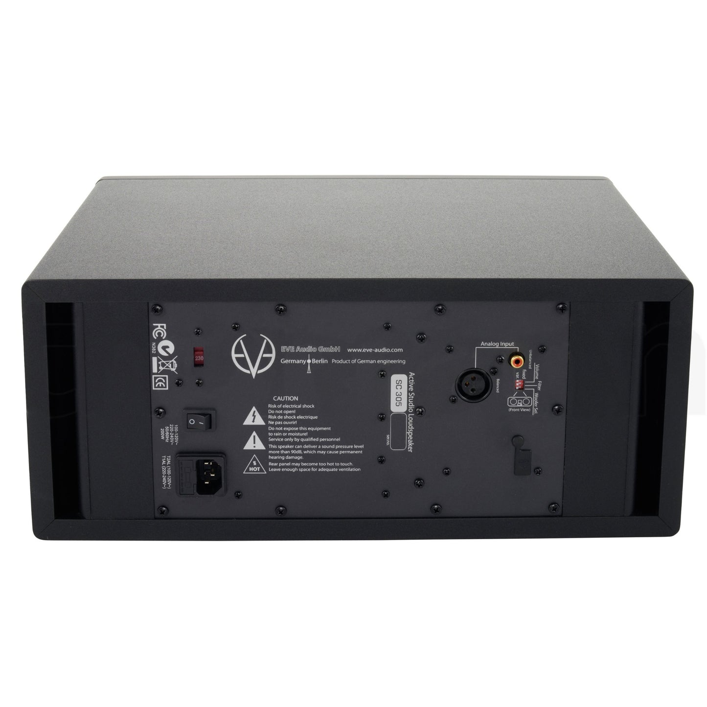 All EVE Audio monitors feature a high-resolution DSP electronics. A high-quality analog/digital converter from BurrBrown (24bit/192kHz) converts the analog input signal supplied via RCA or XLR. The DSP ensures latency-free filtering and simultaneously protects the entire frequency range from overload. When switched on, the volume of the monitor increases slowly to leave enough time to reduce the source volume if the input signal is too loud.