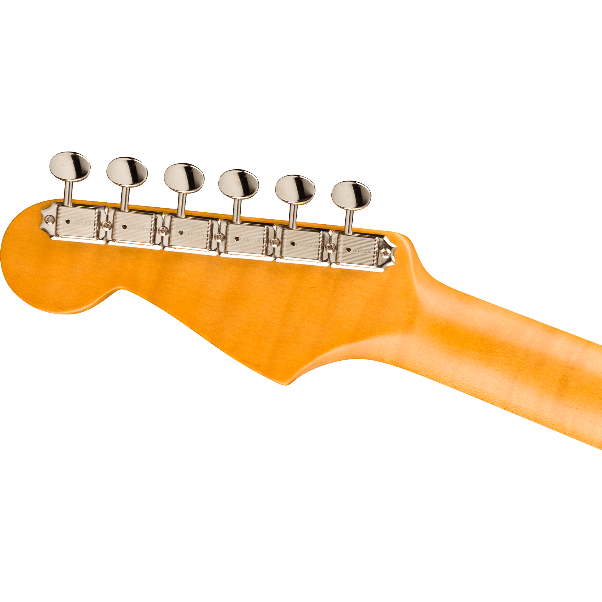 During the late '50s and early '60s, the popularity of Fender musical instruments flourished, and although the Fender assortment had expanded to include many great new instruments, the Stratocaster® reigned supreme. By 1961, the Stratocaster had taken on a more refined aesthetic, with a 3-Color Sunburst reformulated with a more vibrant red and bolder black edge, topped with a 3-ply pickguard accenting the Strat's signature curves.