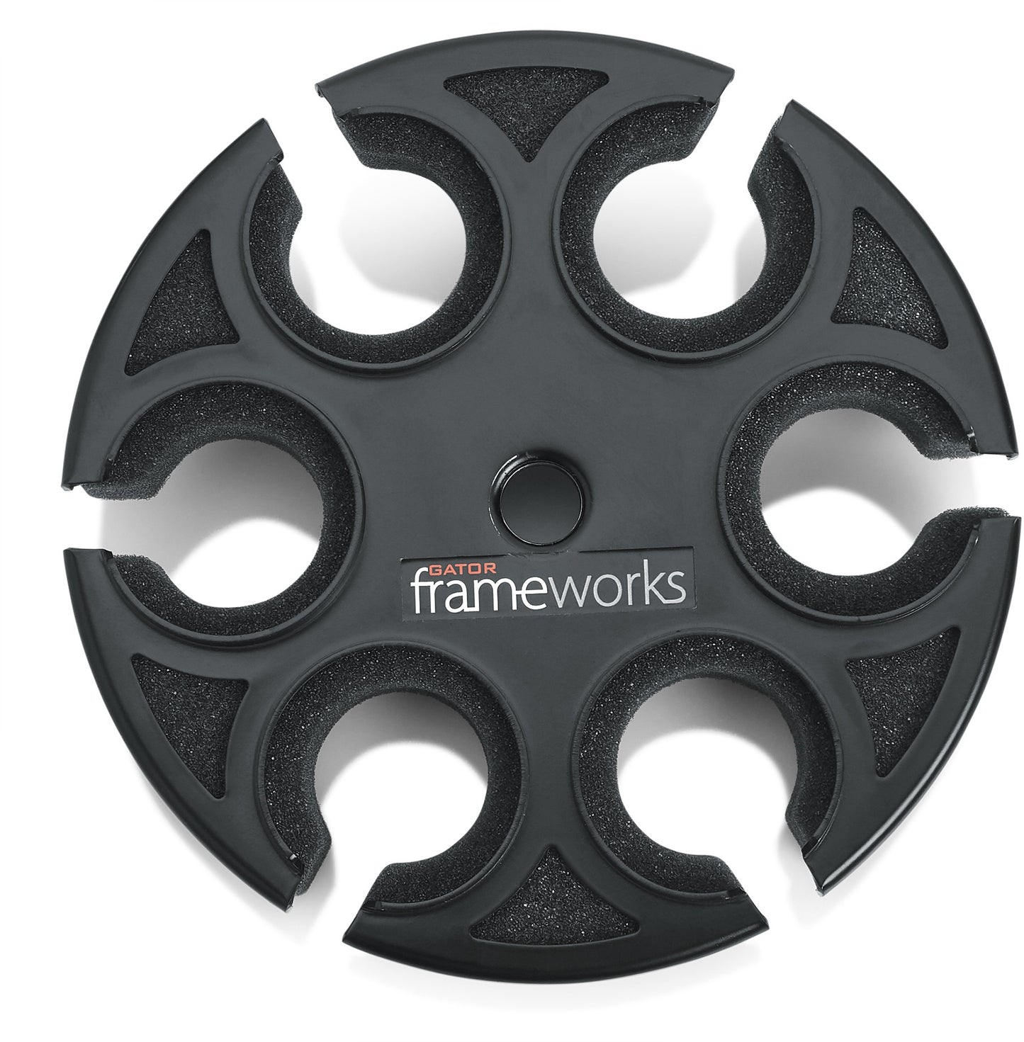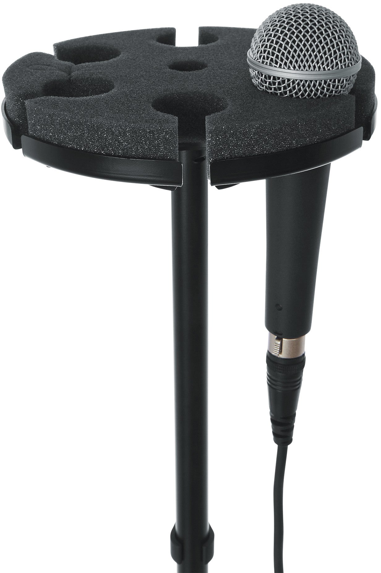 Gator Frameworks GFW-MIC-6TRAY six capacity microphone tray quickly and easily attaches to most standard microphone stands. The steel base firmly holds the microphones in place while the foam padded cradle cushions the microphones and minimizes noise when placing or removing microphones in the tray. The circular design of the GFW-MIC-6TRAY fits six microphones into a small space Perfect for small clubs to concert venues. When you need to have access to multiple microphones but need to keep them organized, protected and close at hand, The GFW-MIC-6TRAY from Gator Frameworks is ready to assist.