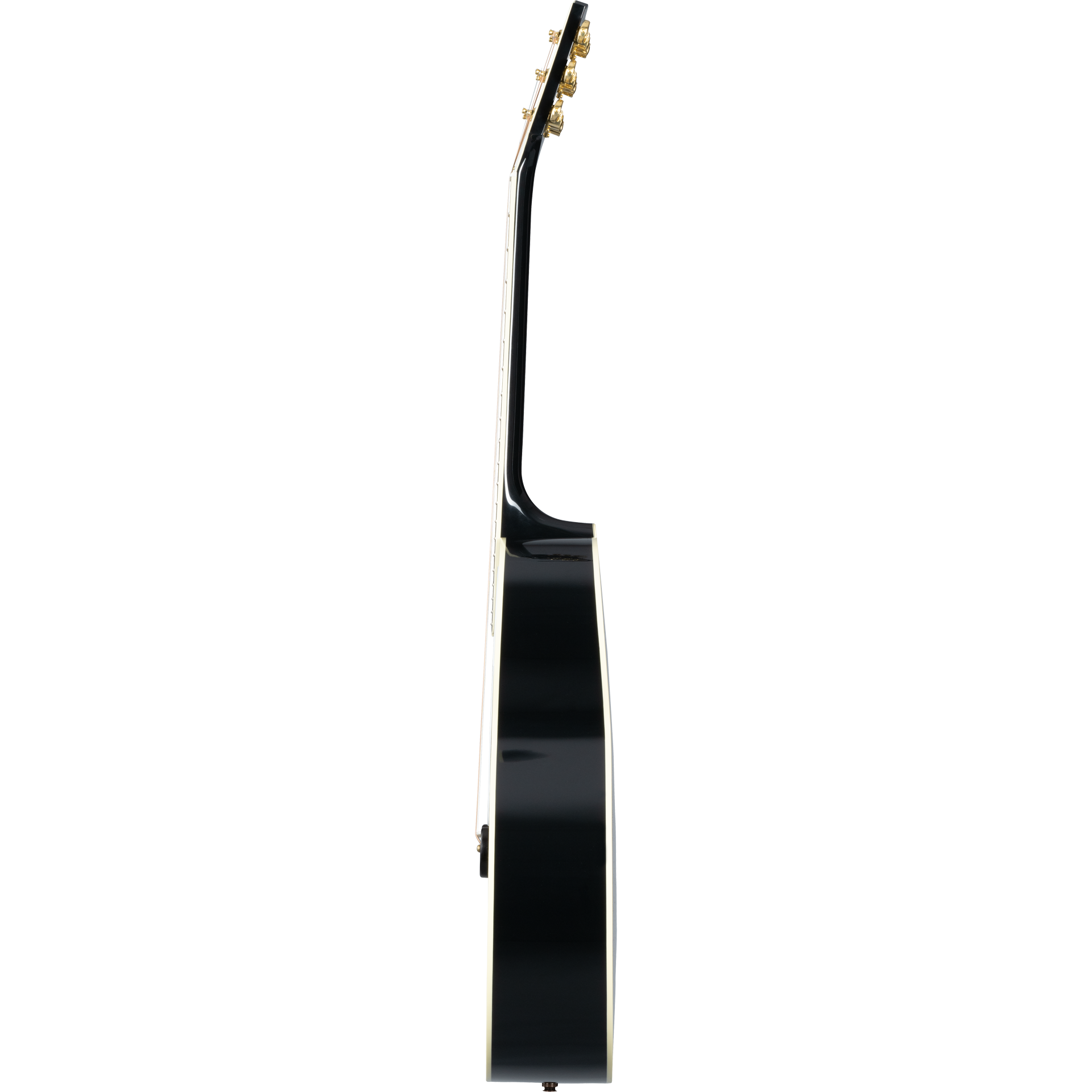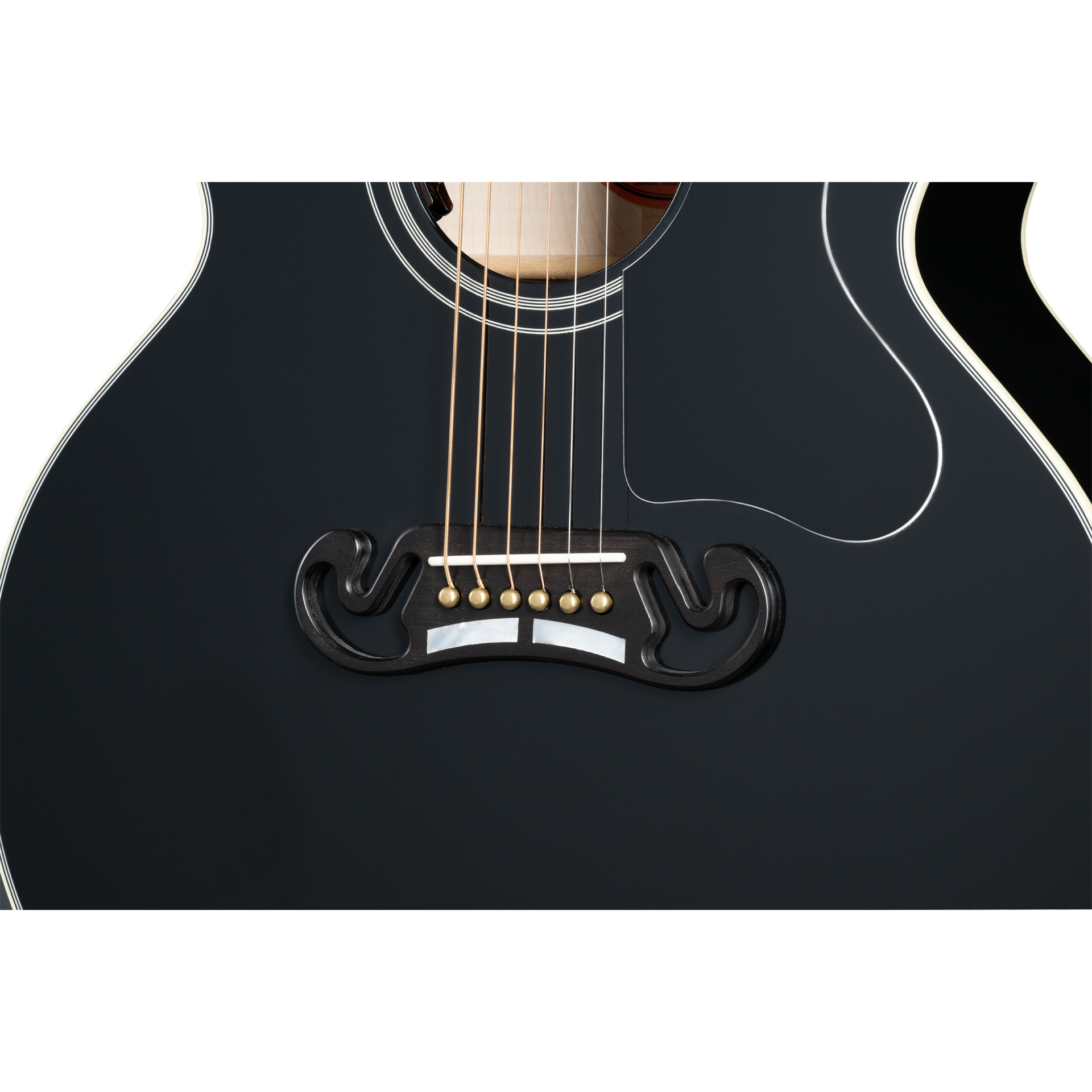 The SJ-200™ is renowned worldwide as the “King of the Flat-tops.” First introduced in 1937, musical legends have embraced this superlative instrument across genres for generations. The Super Jumbo flamed maple body, paired with a Sitka spruce top, delivers outstanding tone and unparalleled projection. This version of the SJ-200 gets the Custom treatment with Les Paul™ Custom-inspired cosmetics, including an Ebony nitrocellulose lacquer finish, multi-ply binding on the top and back, a bound Les Paul-style peghead with a Custom split diamond inlay in mother of pearl, a bound ebony fretboard with mother of pearl Custom Block inlays, and gold Grover® Rotomatic® tuners. It comes equipped with a hardshell case and L.R. Baggs™ Session VTC electronics for plug-and-play use on stage or in the studio.