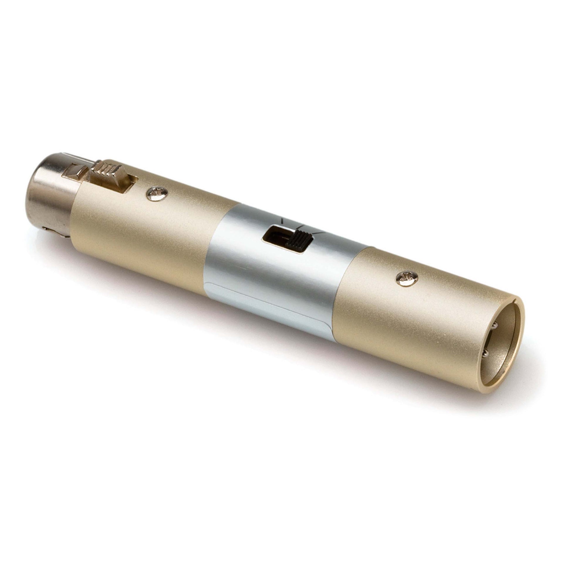 This adaptor is designed to add attenuation to a dynamic microphone. Selectable -20 dB, -30 dB, or -40 dB attenuation make it ideal for karaoke, public speaking, and other events during which a single microphone is shared.