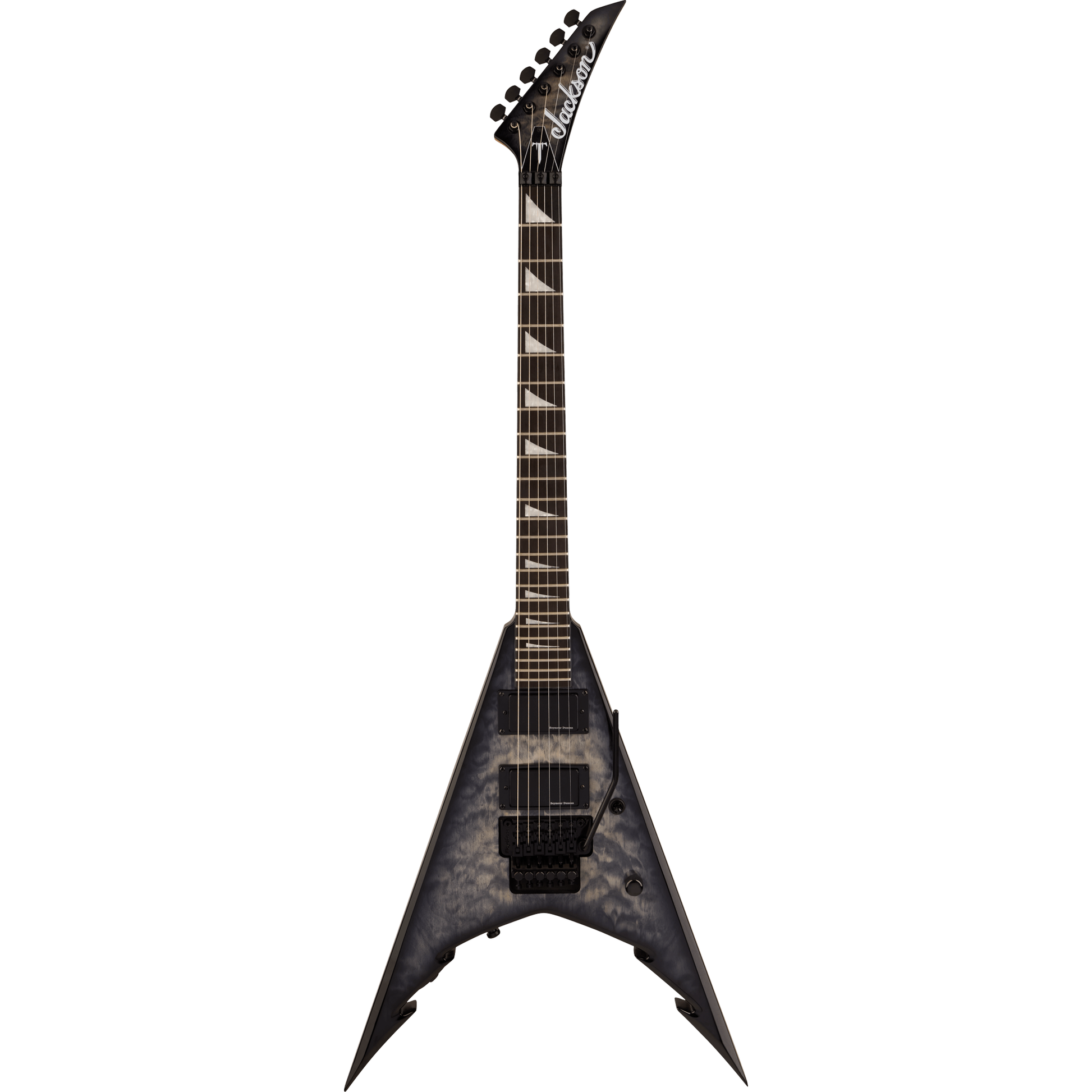 Ready to throttle stages at a moment's notice, the Pro Series Signature Corey Beaulieu King V KV6Q is blanketed in a trans black finish with matching Jackson pointed 6-in-line tilt-back headstock, black headstock binding and black hardware.