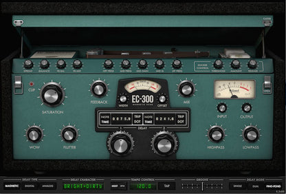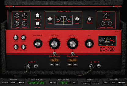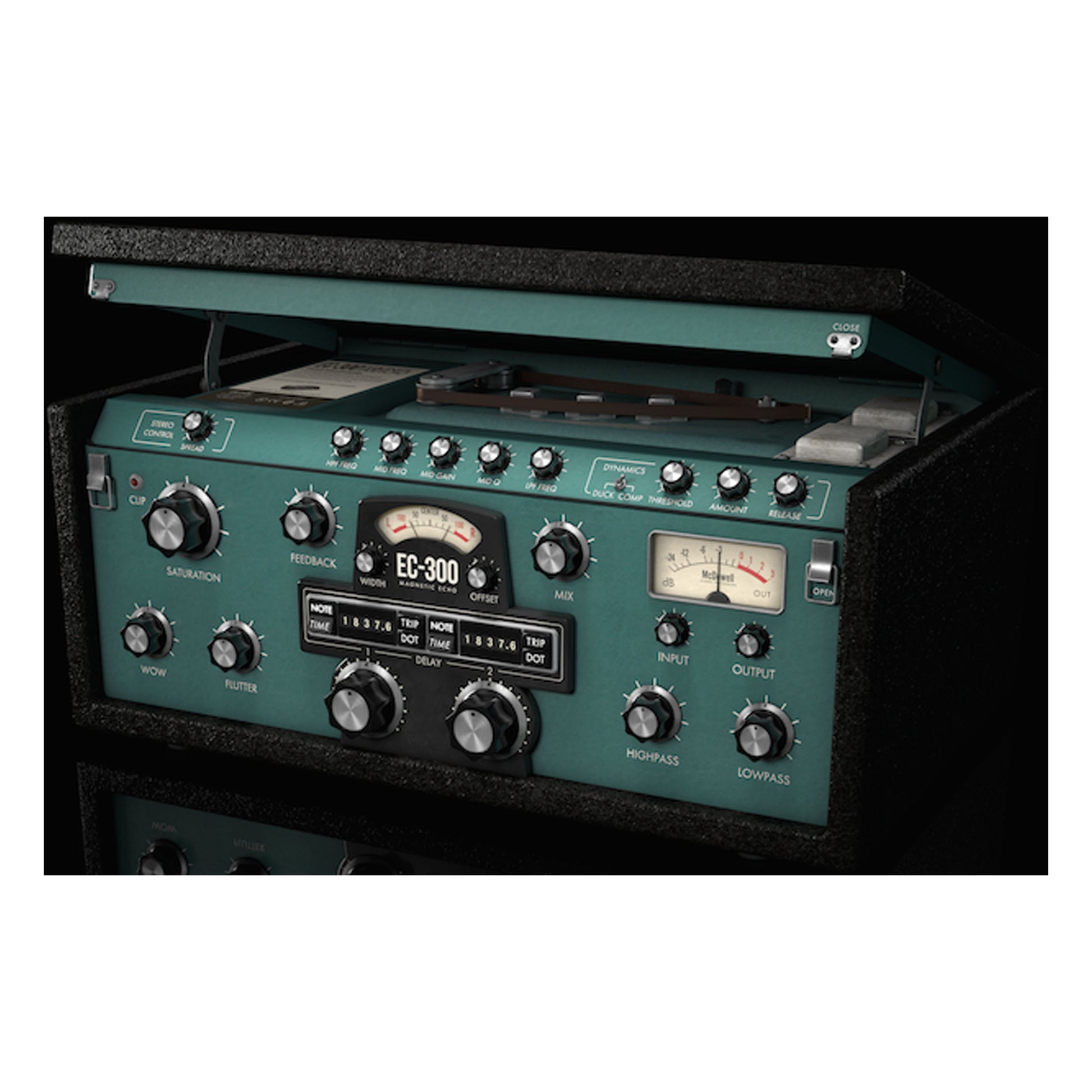 Each EC-300 delay type comes with additional character modes to create new and unique sounds. Other delay features include adjustable saturation, wow and flutter, delay output ducking, in-loop filtering and EQ, and level control at the input and output stages. The EC-300 can operate in single, dual, and ping-pong modes, and delay time can be synced to session playback or to a tapped tempo.