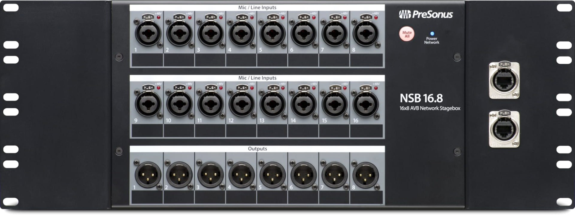 - Sturdy metal rack ear mounting kit for one (1) PreSonus NSB 16.8
