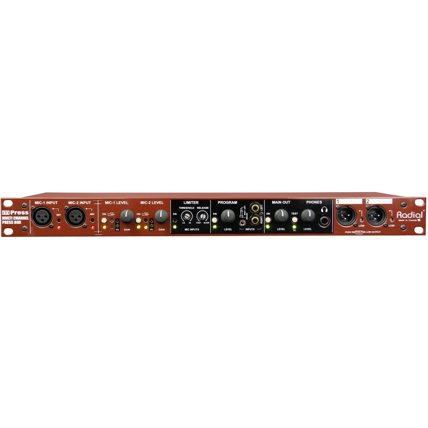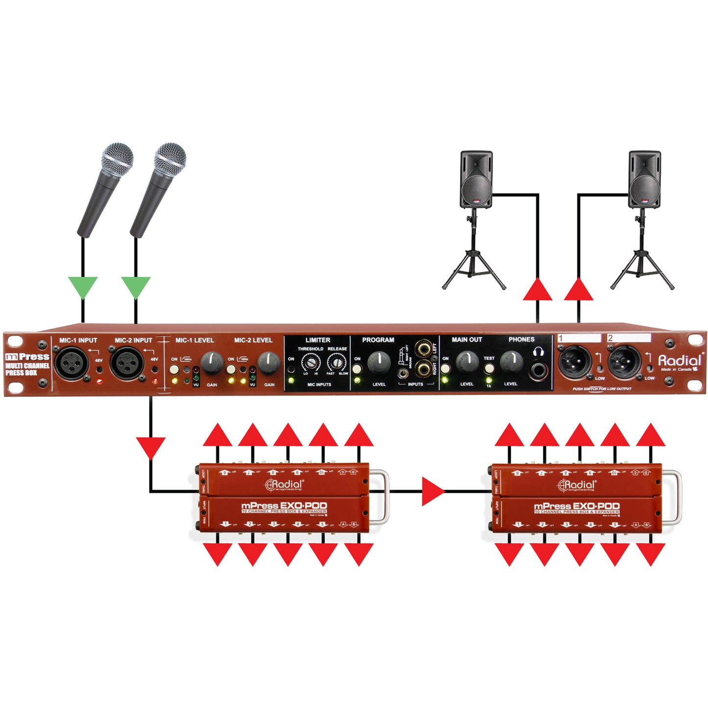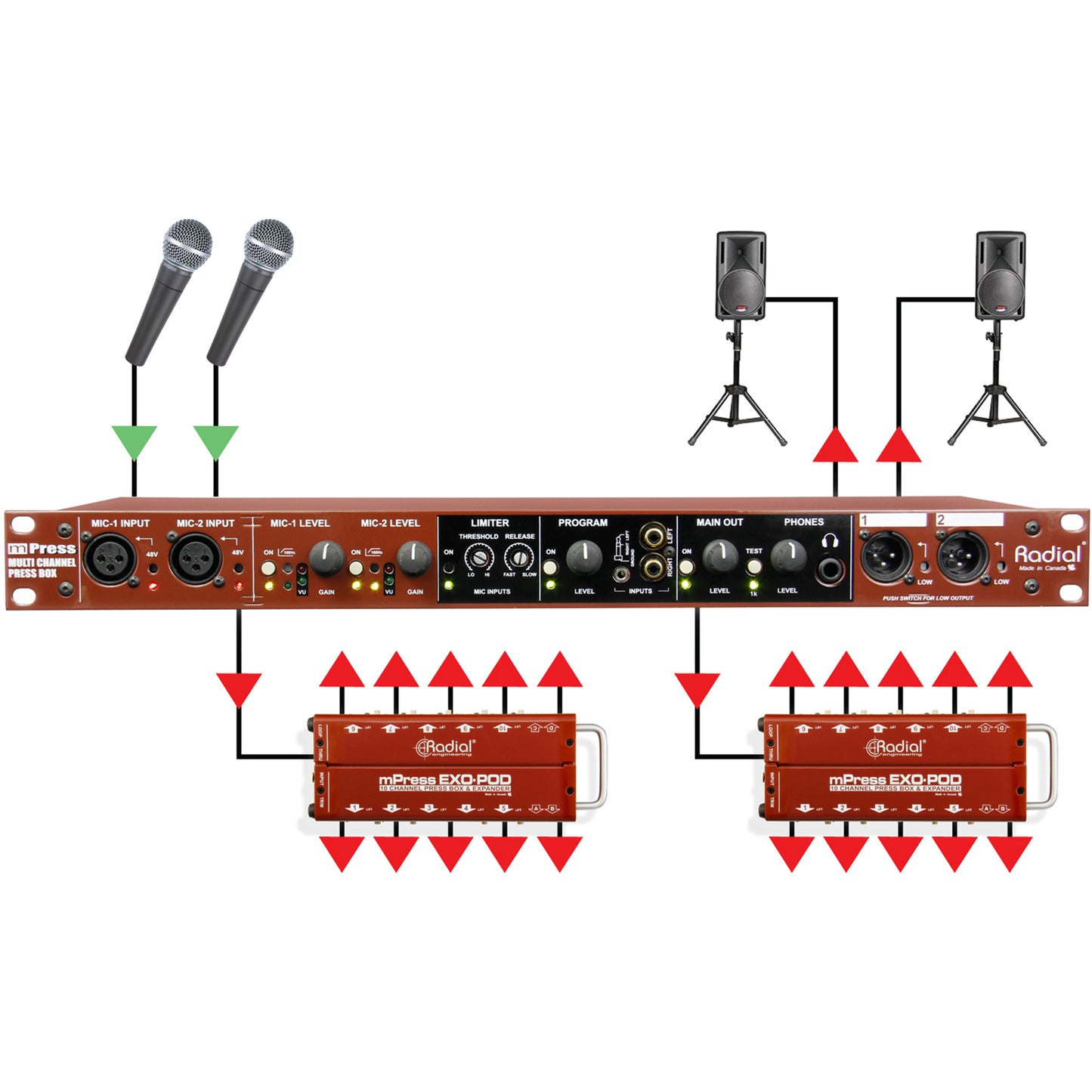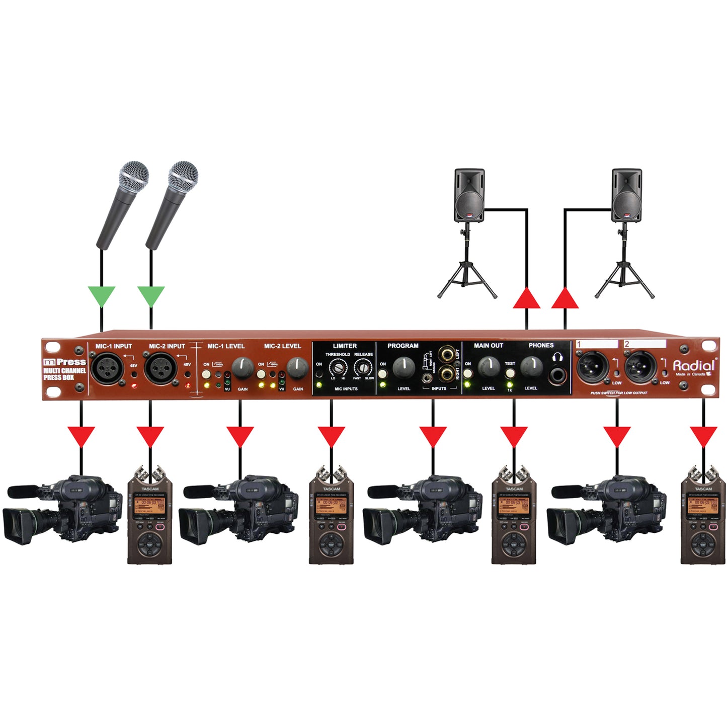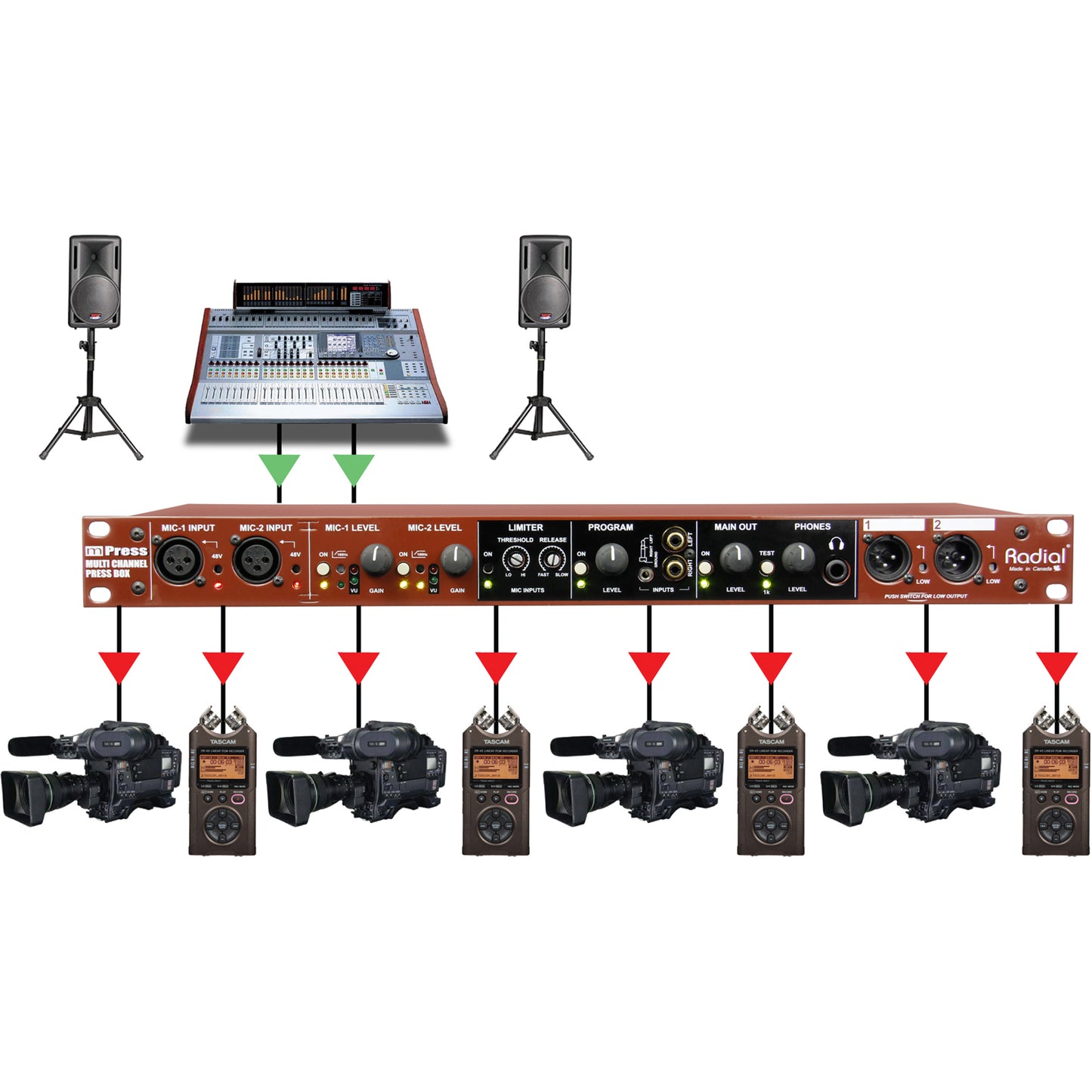 The Radial mPress is a modular press box that can be expanded as needed to feed a community-sized press gallery or distribute audio for an international event.
