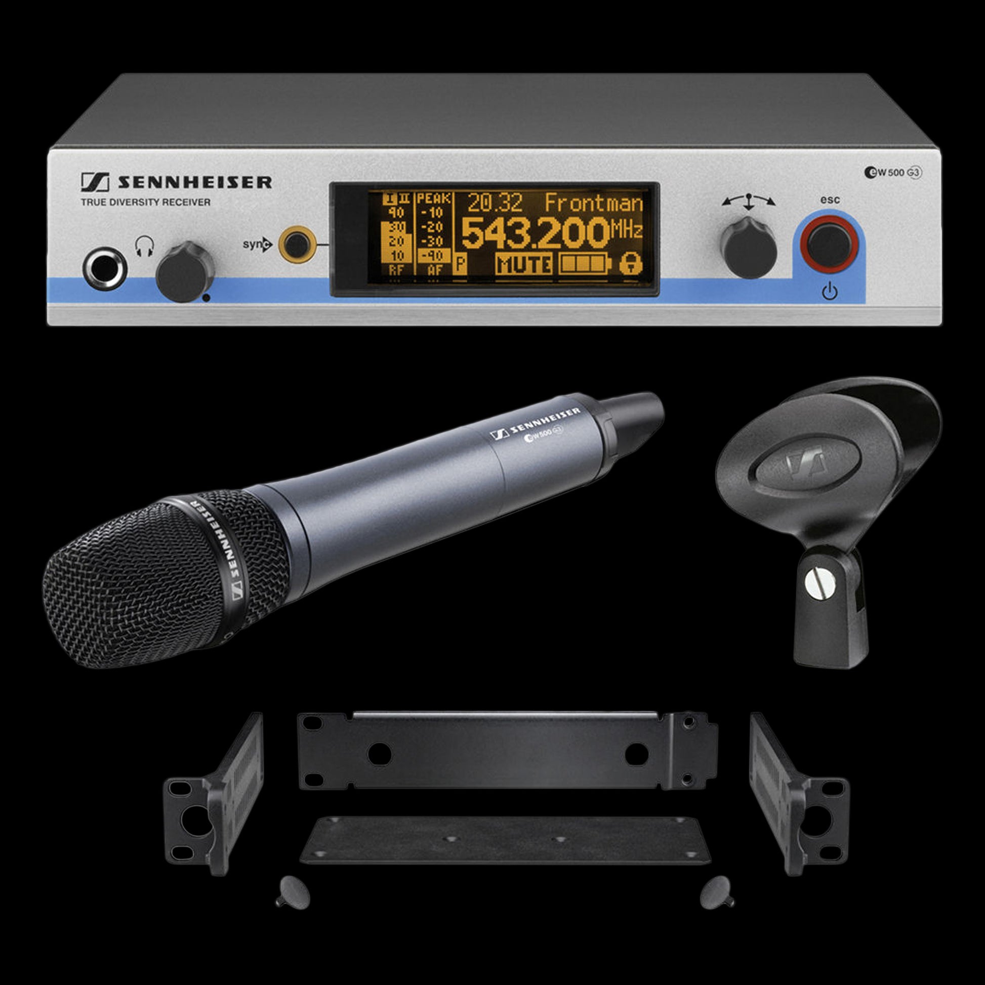 - SKM500 G3 handheld transmitter with e945 super cardioid dynamic capsule and EM500 G3 rack-mountable diversity receiver with GA3 rack mount kit.