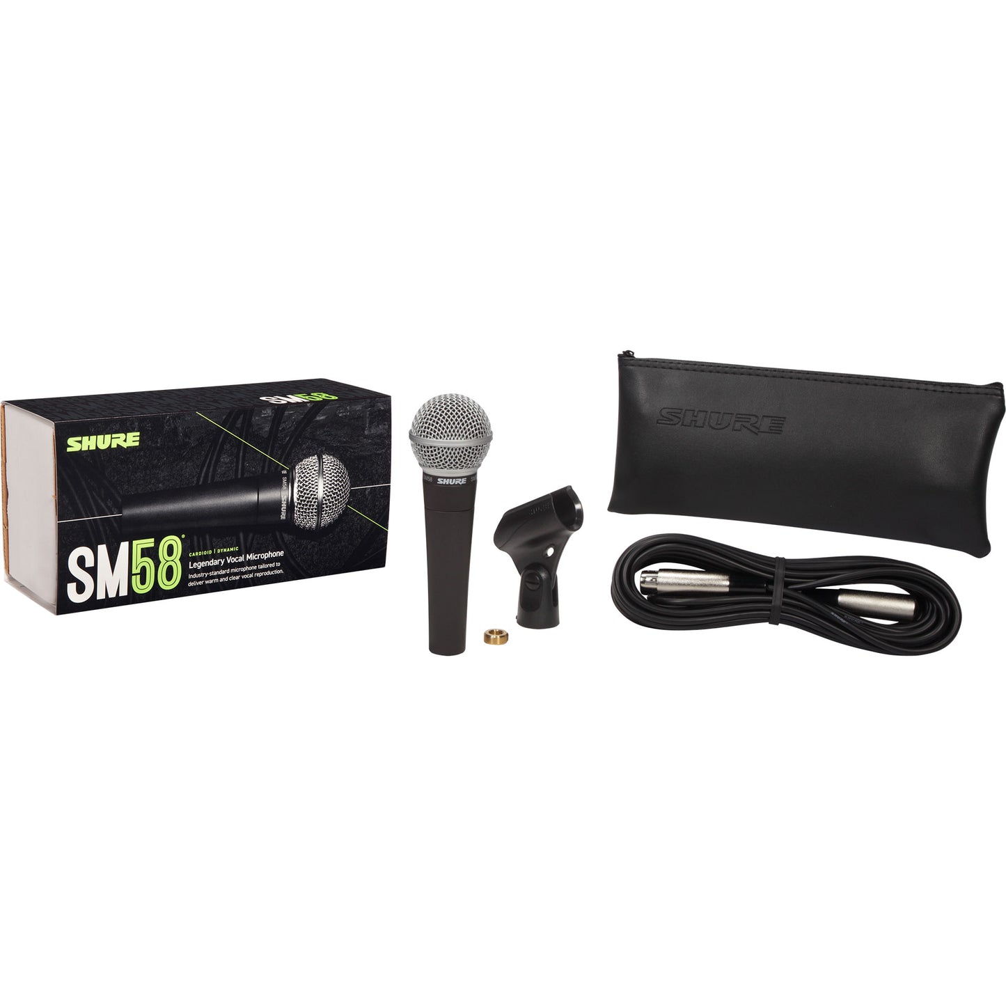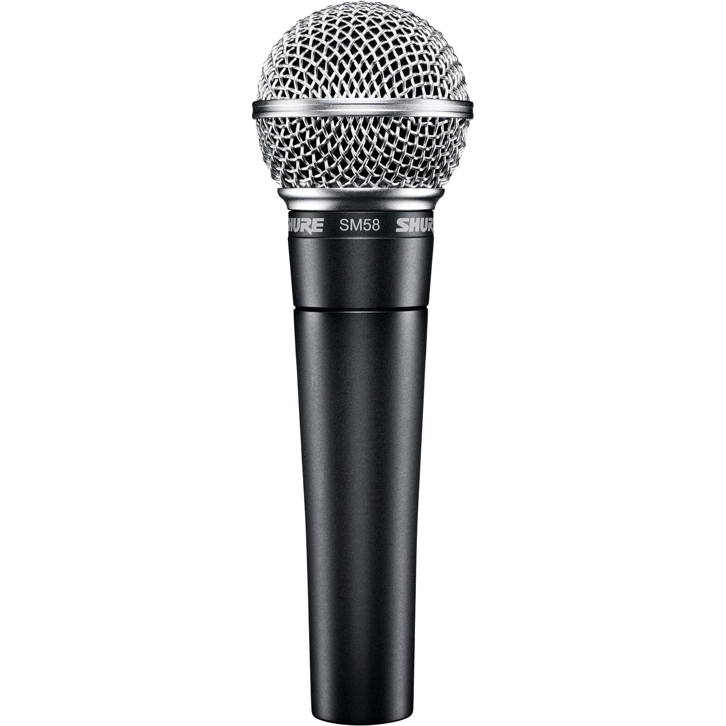 The Shure SM58 is a unidirectional (cardioid) dynamic vocal microphone for professional vocal use in sound reinforcement and studio recording. A highly effective, built-in, spherical filter minimizes wind and breath “pop” noise. A cardioid pickup pattern isolates the main sound source while minimizing unwanted background noise. The SM58 has a tailored vocal response for a sound which is a world standard.