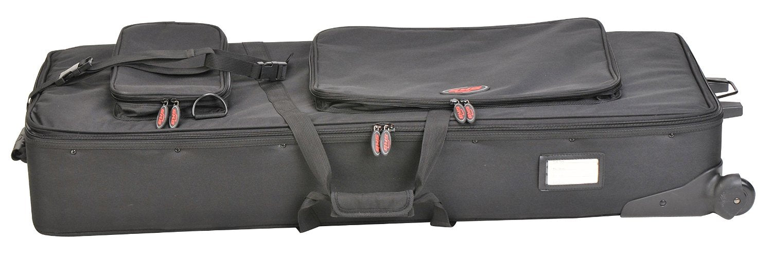 For decades, SKB has been the most innovative manufacturer of top-quality cases and accessories. Famous for their unwavering attention to quality and detail, purchasing an SKB case is sure to provide the most service life of any case on the market. So much so...that SKB offers their Limited Lifetime Warranty on their cases. Buy SKB...buy with confidence. A new option for keyboardists, the keyboard soft case. The soft case is constructed of wood framed walls and an outer 600 Denier nylon covering with a completely padded interior. Two large padded straps provide protection and security with in-line skate wheels and legs with an expanding stabilizer for standing the case on end. The back and side of the case features rails to protect the case when loading and unloading. Two large pouches on the lid for storage of cables, pedals and other accessories. Convenient straps provide for a hands free carry and for connetion other bags.