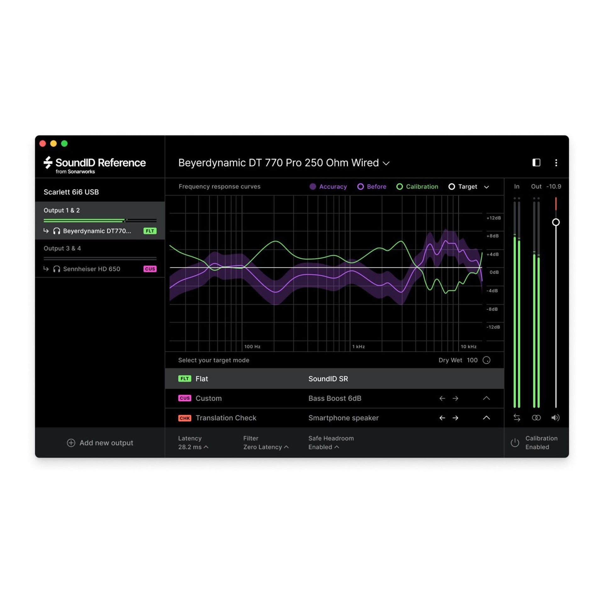 A headphone calibration software delivering consistently accurate studio reference sound on your existing headphones. The software includes presets of more than 280 headphone calibration profiles. With an applied headphone calibration profile the software sets the frequency response target to be completely flat across all audible frequencies. The headphone frequency response target is designed to emulate neutral-sounding speakers. With calibrated headphones, you’ll hear a flat, consistent sound wherever you go.