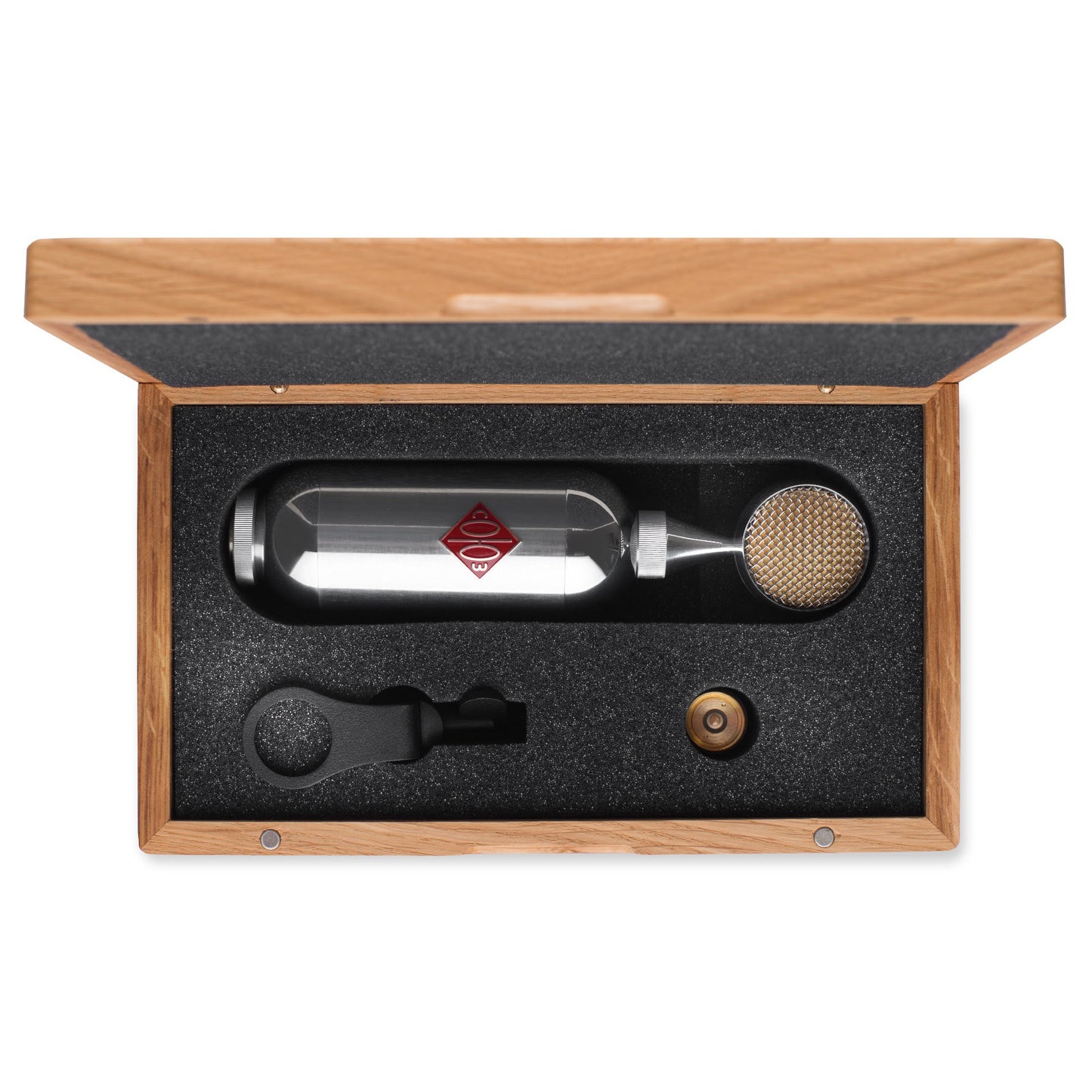 The package includes a mic clip, as well as a beautifully designed wooden case with form fitting foam to secure the microphone. The custom case is latched with heavy duty magnets to ensure safe travel from the mic locker to your live room or isolation booth.