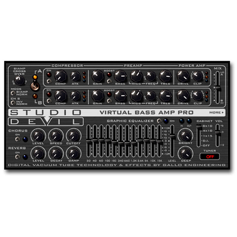 Studio Devil Virtual Bass Amp Pro is a bass amp modeling and audio effects plug-in for use with VST, AudioUnits, and ProTools RTAS compatible hosts running on both Mac and Windows platforms. It contains two discrete channels each with independent compressor, gain, tone, and limiter controls modeled using Studio Devil’s patented digital vacuum tube modeling technology!
