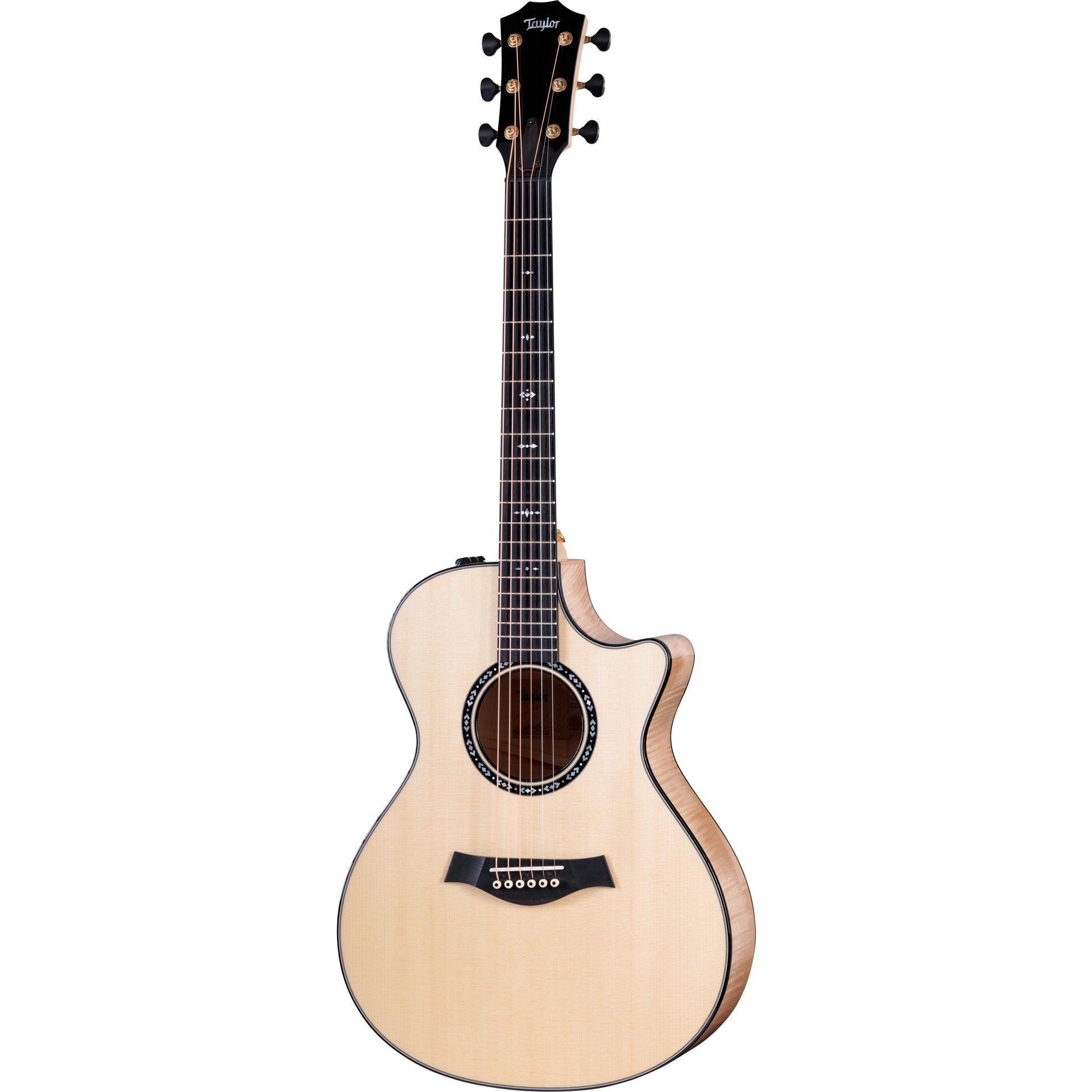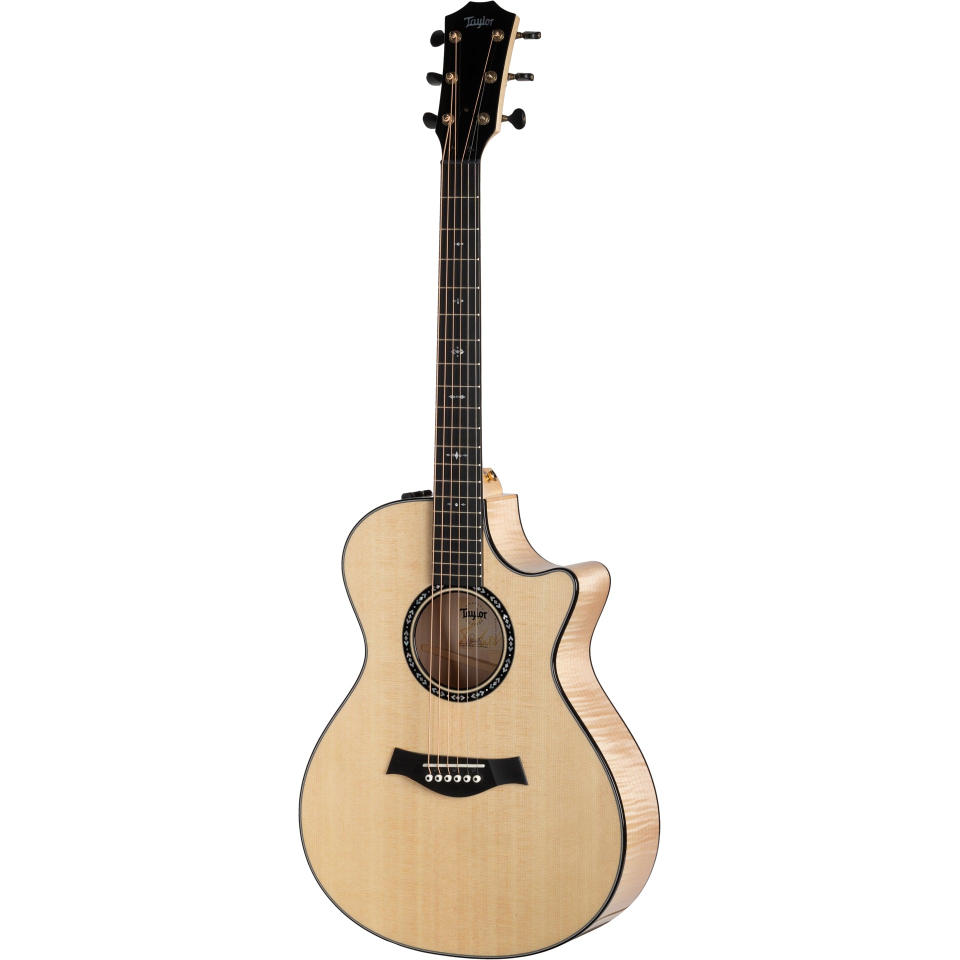 Sporting Taylor’s world-famous playability, the C12ce has a super-stable Rock Maple neck with a smooth satin finish and Taylor standard C-shaped neck carve. Adorned with custom diamond and circle “Nations” inlays, the premium Crelicam Ebony is especially notable for its deep, rich hue mixed with natural cream-colored striations. Along with the ‘board and rosette, Crelicam Ebony’s striking looks are employed as body and neck binding, headstock overlay, and reverse side stinger.
