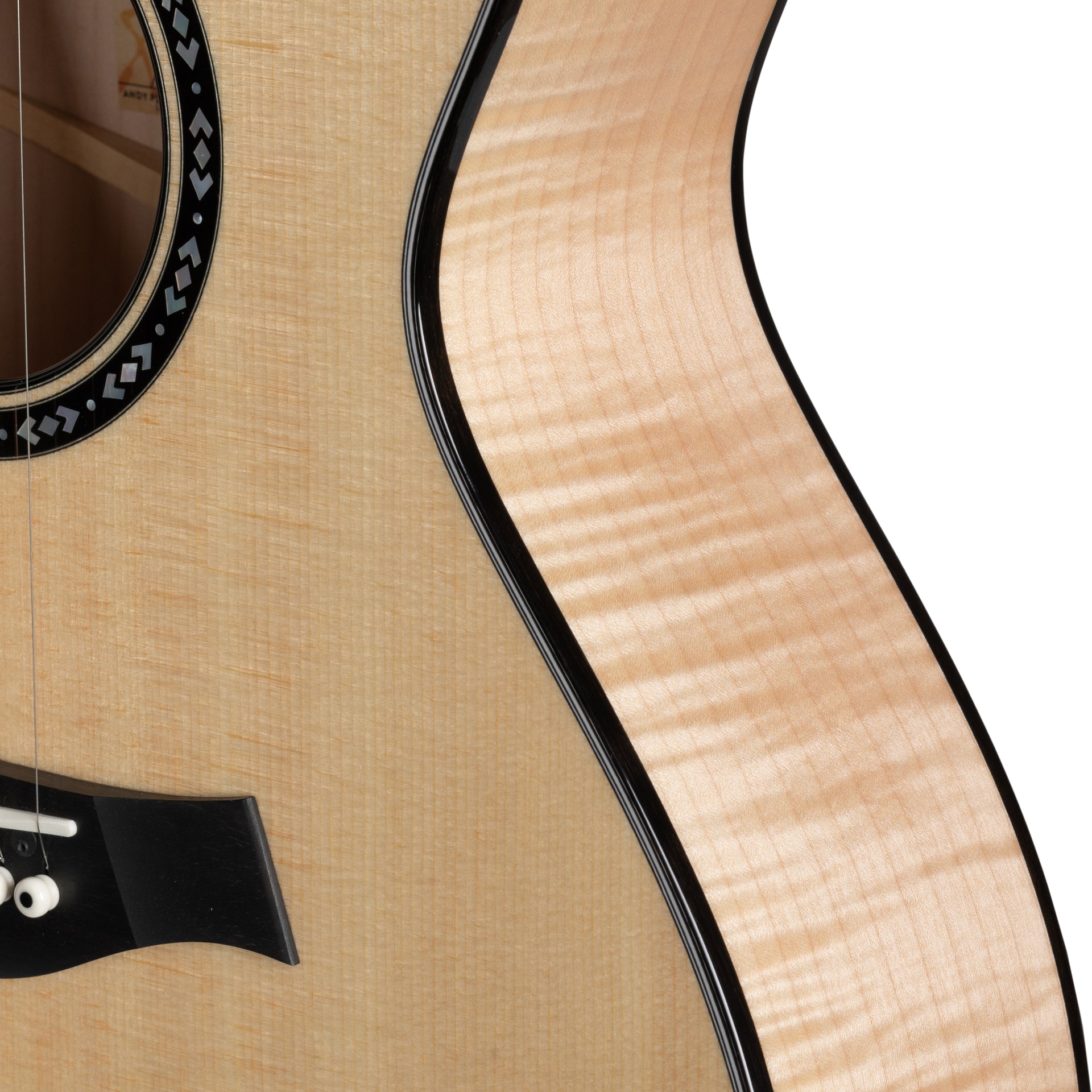 Known for its power, player responsiveness, “pale white” color, and magnificent figure, the top is paired with Northwestern “Big Leaf” Maple back sides for focus, added projection, and beauty. Additional visual enhancements on the body include a mother-of-pearl-inlaid Crelicam Ebony Rosette and soundhole binding that beautifully complement the naturally contrasting presentation of this one-time-only special edition.
