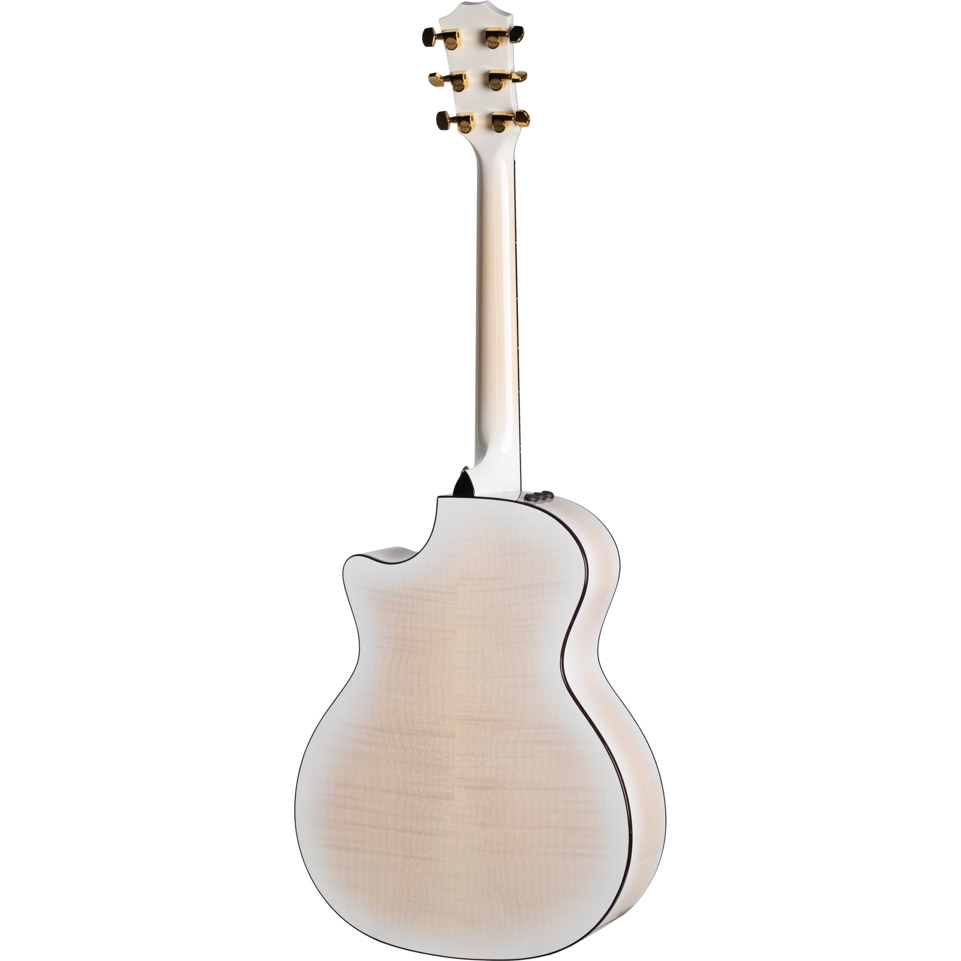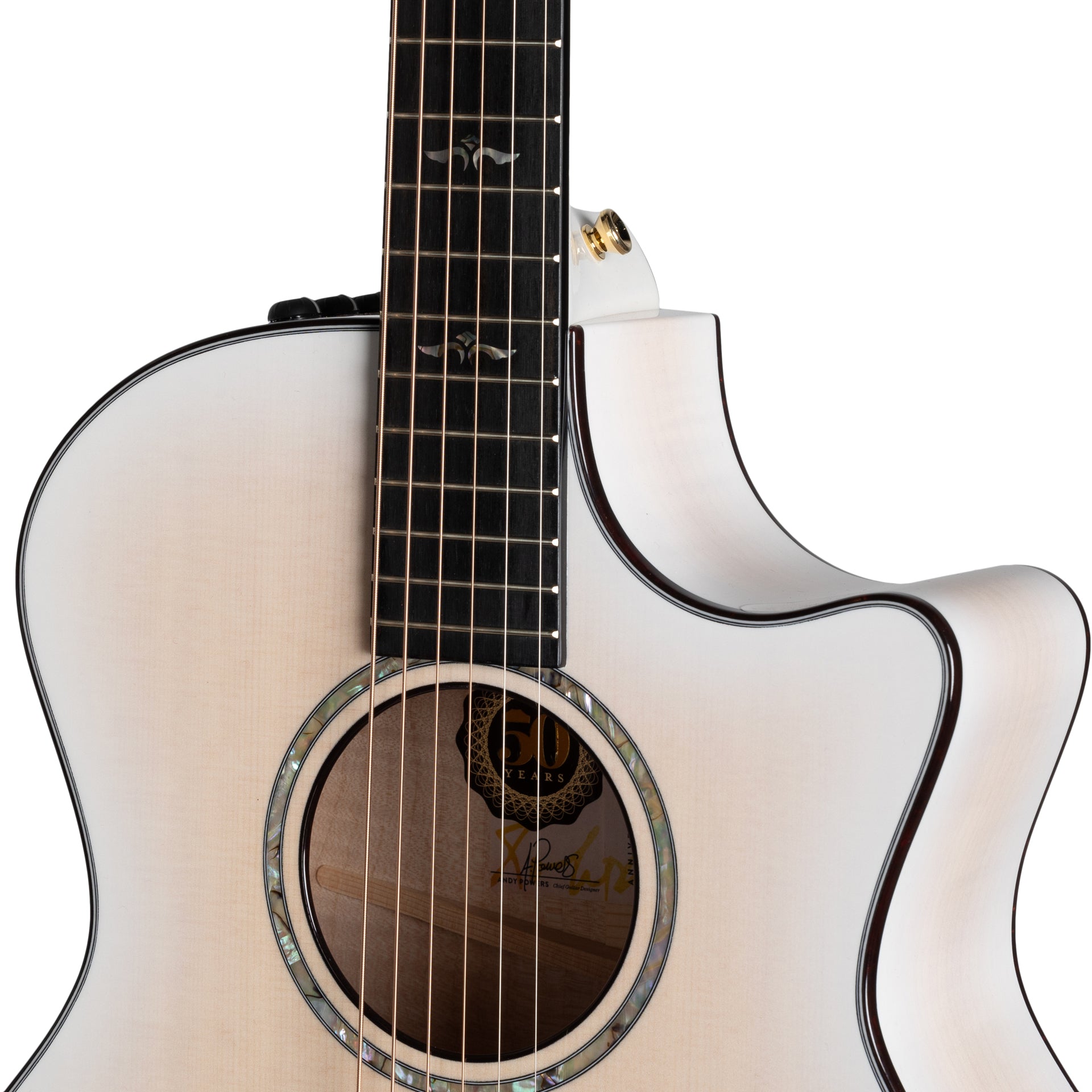 With its milky-hued transparent white finish and white edgeburst, the 50th Anniversary 614ce LTD adds another unique entry to Taylor's lineup of celebratory limited-edition guitars. This Grand Auditorium, crafted with back and sides of solid, figured Big Leaf maple and a Sitka spruce top, serves up a sophisticated voice that balances a clear, vibrant midrange with pleasing sonic warmth. The V-Class bracing architecture levels up the volume, sustain and projection and beautifully channels the nuances of each player’s individual touch, with impeccable pitch accuracy all the way up the neck. Along with the unique trans white/edgeburst treatment on the body and neck, this model boasts a single-ring rosette in green abalone with matching Wings fretboard inlays, faux-tortoiseshell body binding, a gloss-finish body, gold hardware that complements the subtle blonde complexion of the maple and spruce, ebony bridge pins with gold acrylic dots, and a commemorative 50th Anniversary interior label. It ships with ES2 electronics and a deluxe brown hardshell case.