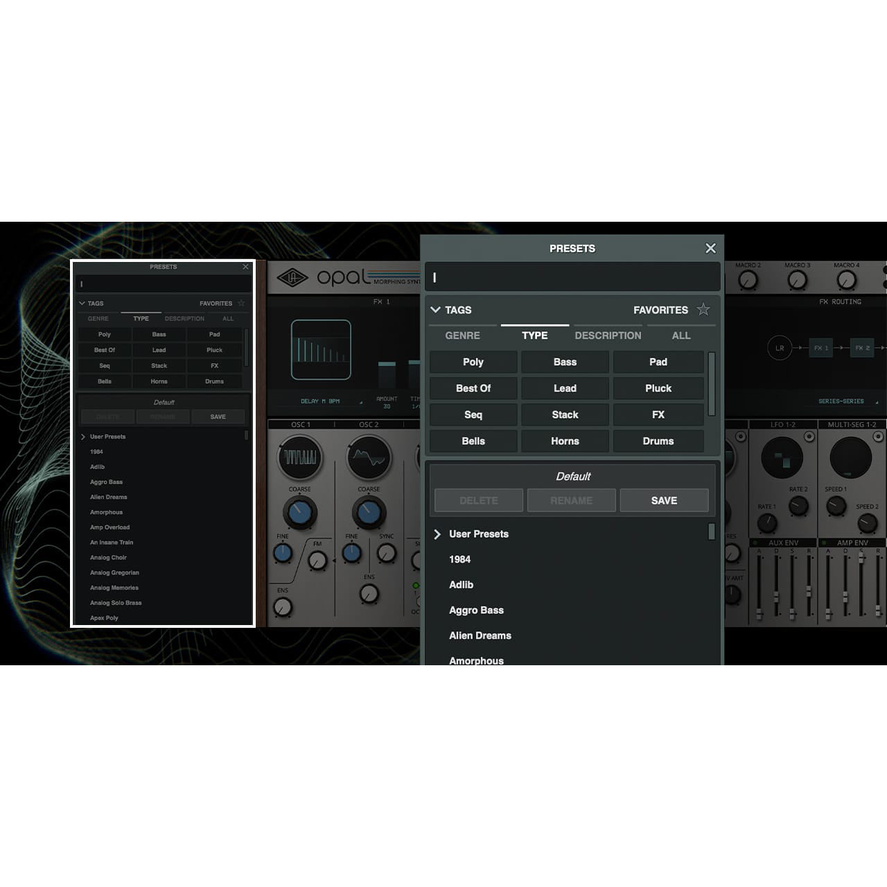 Get just the right sound using Opal's gorgeous presets, lovingly crafted by the synth geeks deep within the halls of UA. Curated for fast use across genres, Opal's presets ensure you'll capture inspiration the moment it strikes.