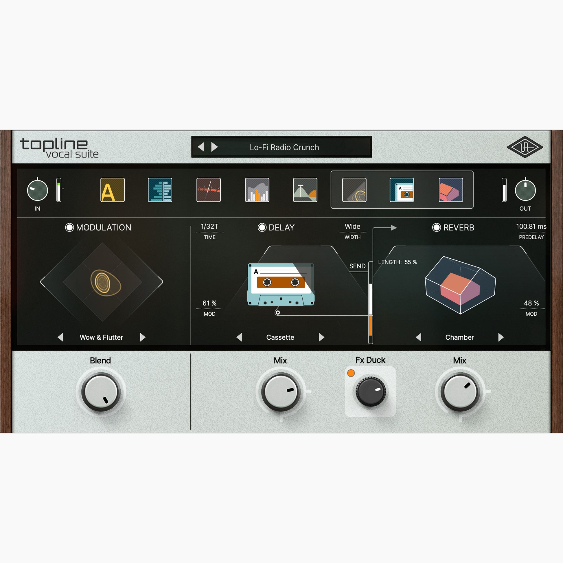 Topline Vocal Suite gives you all the tools you need to easily record and mix flawless professional vocals in any genre, from hip hop to pop to R&B. Topline Vocal Suite is the only plug-in of its kind — perfectly marrying modern vocal tuning with best in class UAD analog studio effects. So you get everything you need to create perfect vocal mixes, effortlessly. Packed with professional presets, Topline Vocal Suite is like having a seasoned engineer in a classic analog studio, crafting tuned, radio-ready vocals just for you.