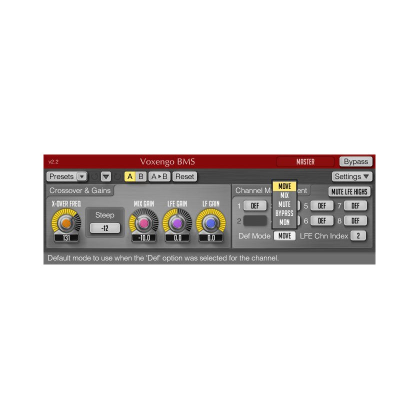 BMS is a bass management system plug-in for professional surround sound applications. BMS is able to extract and manipulate low-frequency content of non-LFE channels in up to 7.1 surround configurations.