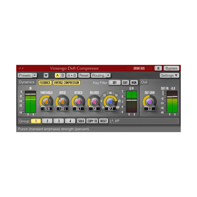 Deft Compressor is perfectly usable for compressing vocals, drums, guitars and other instruments, both technically and creatively. Beside that, it can be used to compress mix groups and full mixes.