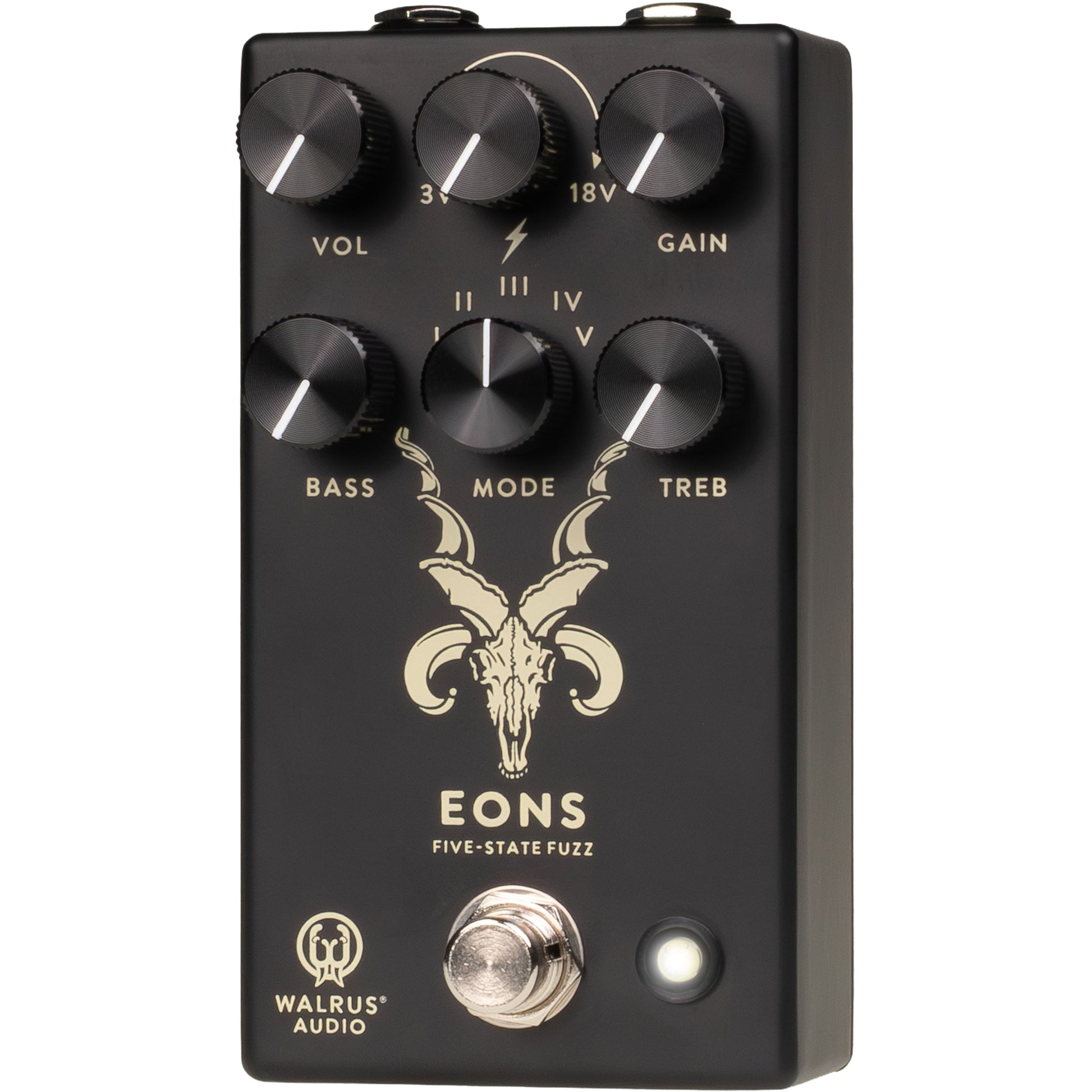 Eons is a five-state fuzz capable of massively thick sounds ready to test the limits of any amp's grill cloth. Use the Voltage (lightning bolt) knob to crank up to 18 volts into the pedal's circuit for massive, open fuzz sounds, or choose to starve it down to 3 volts for spatty, gated fuzz. Experiment with the Voltage and Mode knobs for nearly endless styles of fuzz tones. Find vintage-inspired sounds emanating from the stages of Woodstock to chaotic three-chord punk rock. Eons is ready for a fight.